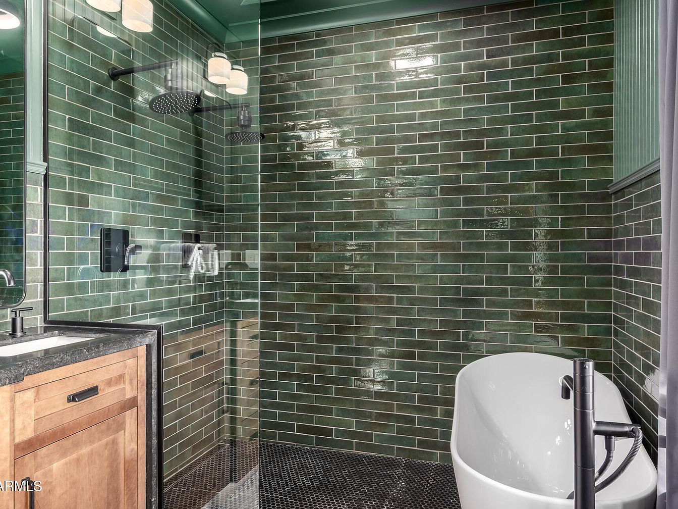 A modern bathroom features glossy green subway tiles covering the shower walls and extending behind a freestanding white bathtub. The room is vibrant with green hues, accented by black fixtures that include a rain showerhead, wall-mounted controls, and a sleek freestanding tub faucet. The sink vanity, located on the left, has a light natural wood tone, complemented by a black countertop and matte black hardware. The floor consists of small, dark hexagonal tiles, adding texture and contrast. Lighting above the mirror and soft green-painted ceiling enhance the inviting, spa-like ambiance of the space.