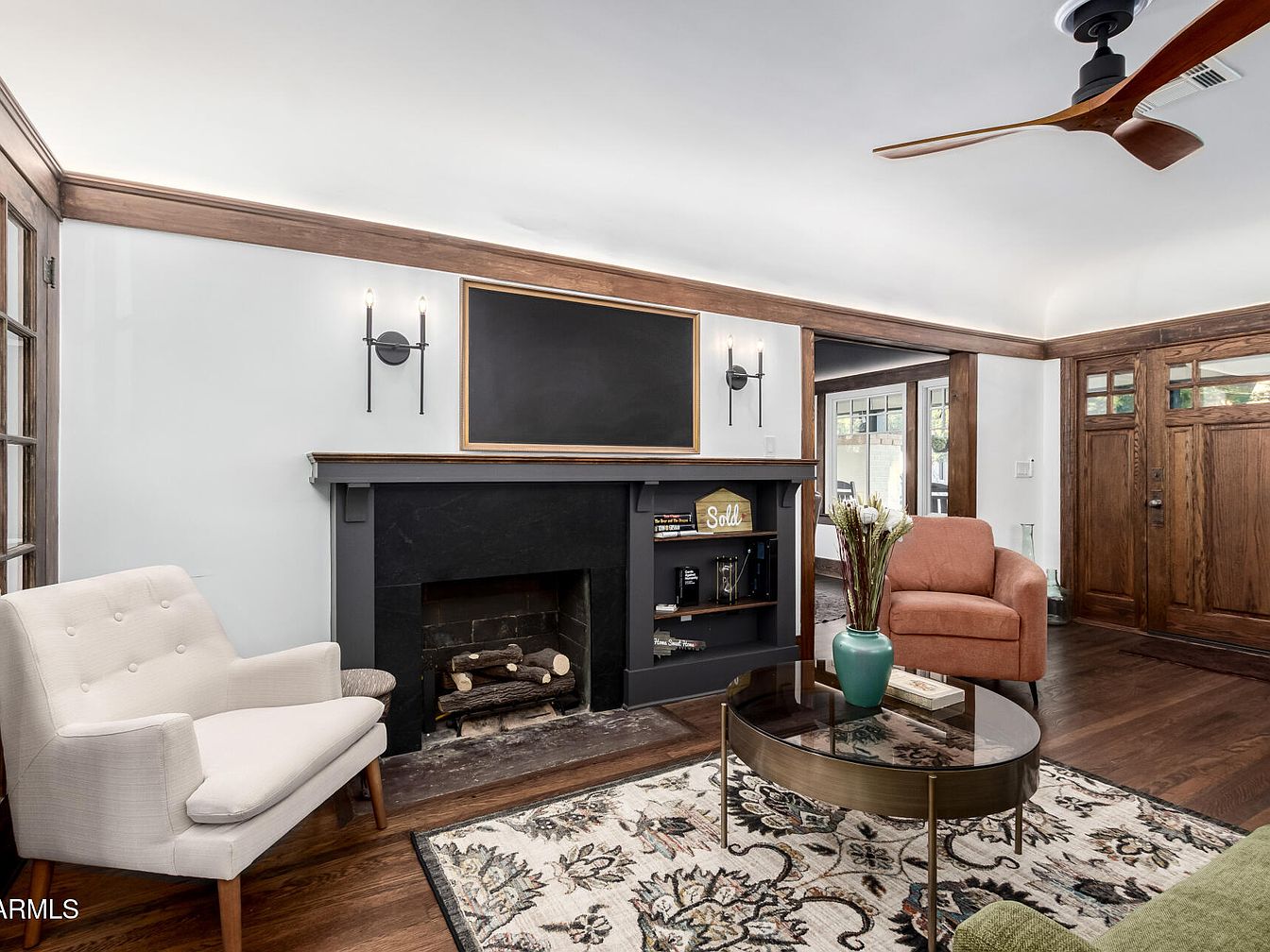 A cozy living room with Craftsman-style architectural details, featuring wooden trim along the ceiling and surrounding the entryway and front door. The space centers around a dark, classic fireplace with a black mantel and a built-in shelf displaying books and a “Sold” sign. Soft taupe walls complement the rich hardwood floors, which are partially covered by a floral patterned area rug. Furniture includes a modern cream-colored chair, a muted coral armchair, and a glass-topped round coffee table topped with a green ceramic vase. Black wall sconces and a sleek ceiling fan add updated, contemporary touches to the traditional backdrop.