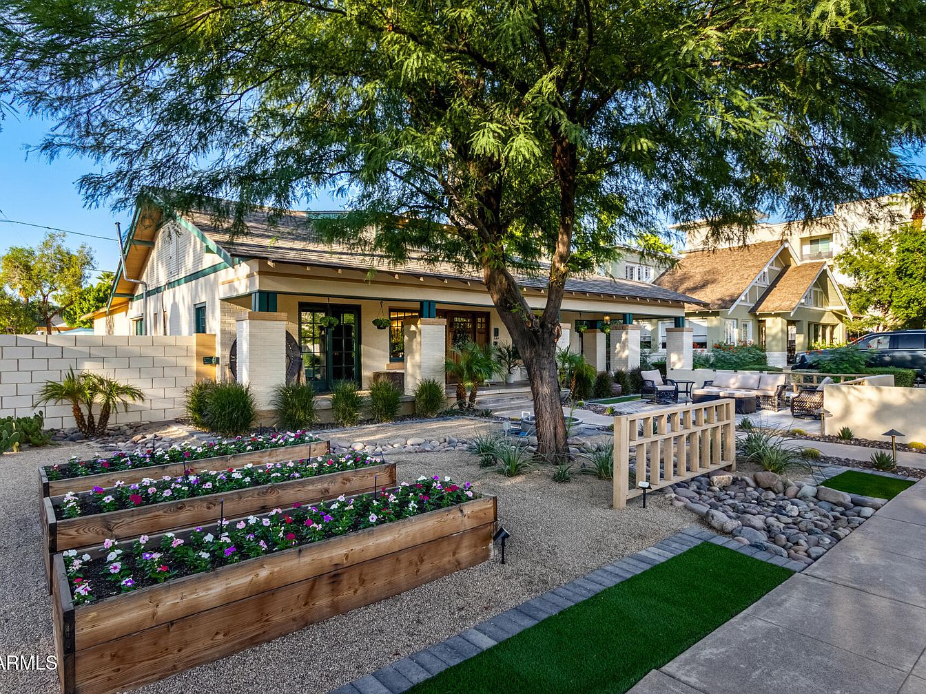 A historic American bungalow is viewed from the front yard, which showcases a xeriscape garden layout with raised wooden flower beds filled with multicolored flowers. The gravel pathway is bordered by rectangular patches of artificial turf and a dry creek bed of smooth river rocks, adding visual interest. At the forefront, a medium-sized tree provides dappled shade, while a low cream brick and concrete wall defines the patio seating area near the entry. Modern landscaping blends with historic charm, complemented by desert plantings like palm and agave, and the house exterior features muted beige walls with green and blue trim.