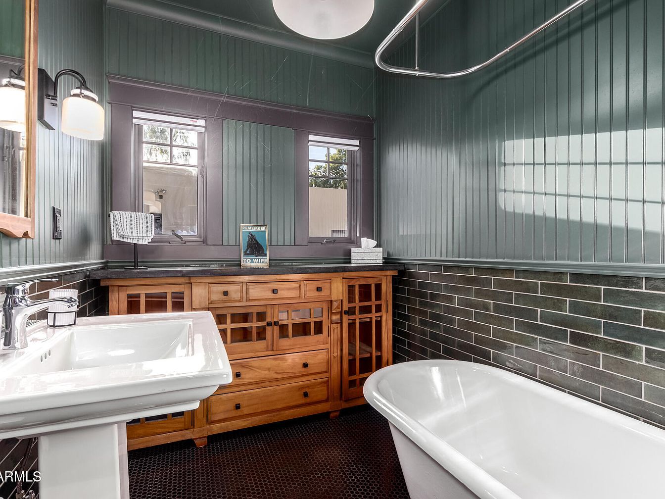 This space features a distinctive blend of vintage and craftsman aesthetics, centered around a freestanding white pedestal sink and a classic clawfoot bathtub. The walls are covered in vertical beadboard paneling painted a muted teal-green, paired with glossy dark subway tile halfway up. A large wooden vanity with glass-front cabinet doors and multiple drawers provides warmth and contrast against the cooler wall colors. Two windows framed in dark trim allow natural light to filter through, while modern light fixtures and a large, round overhead light add illumination. The overall ambiance is inviting and nostalgic, merging old-world charm with subtle modern elements.