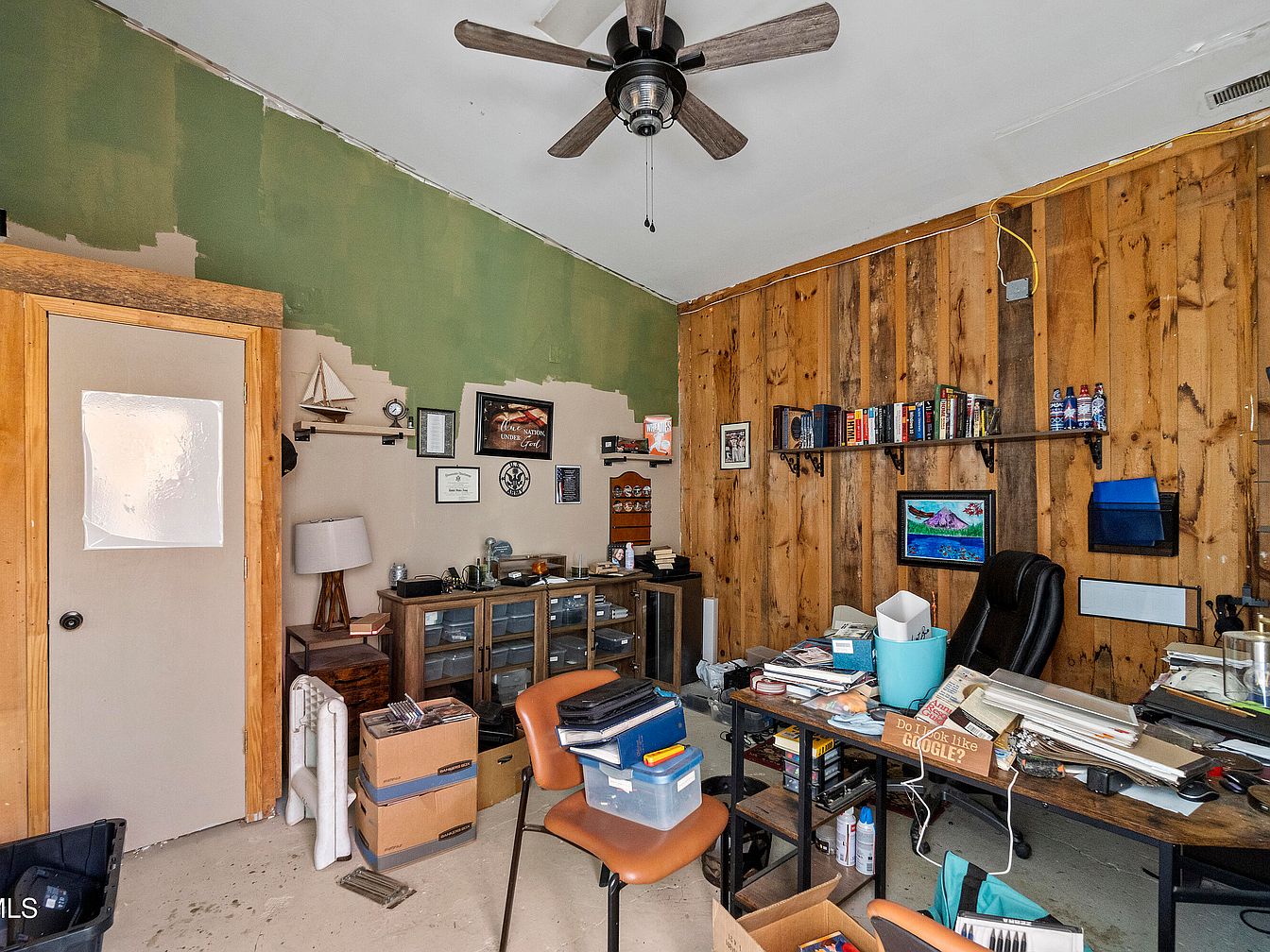 This home office blends rustic and practical elements, featuring natural wood-paneled walls that create a warm, cabin-like atmosphere. The green and beige partially painted walls add a rough, unfinished charm, highlighting its utilitarian purpose. A sturdy wooden desk clutters with papers, storage bins, and office essentials, paired with an ergonomic black chair. Two simple brown chairs provide seating, while floating shelves display books and small decorative items, contributing to organized functionality. A ceiling fan with wood-toned blades complements the natural textures. The space prioritizes work efficiency while maintaining a cozy, handmade aesthetic.