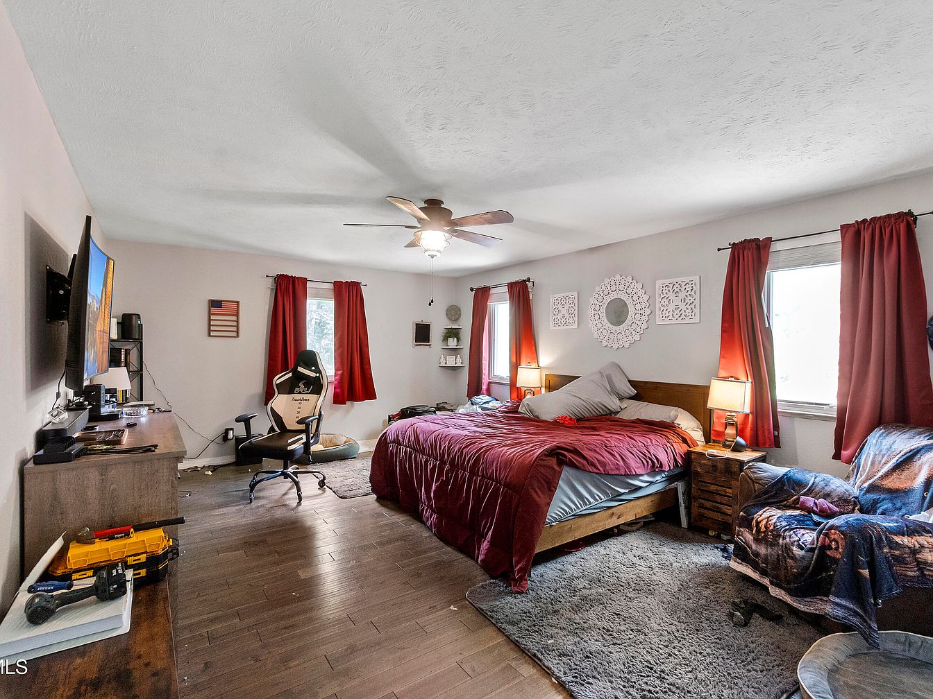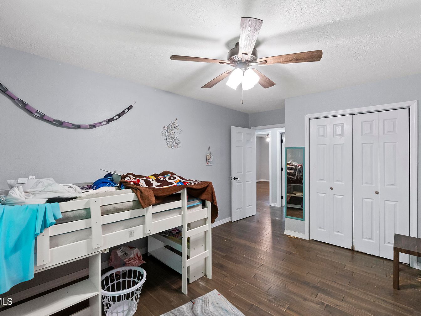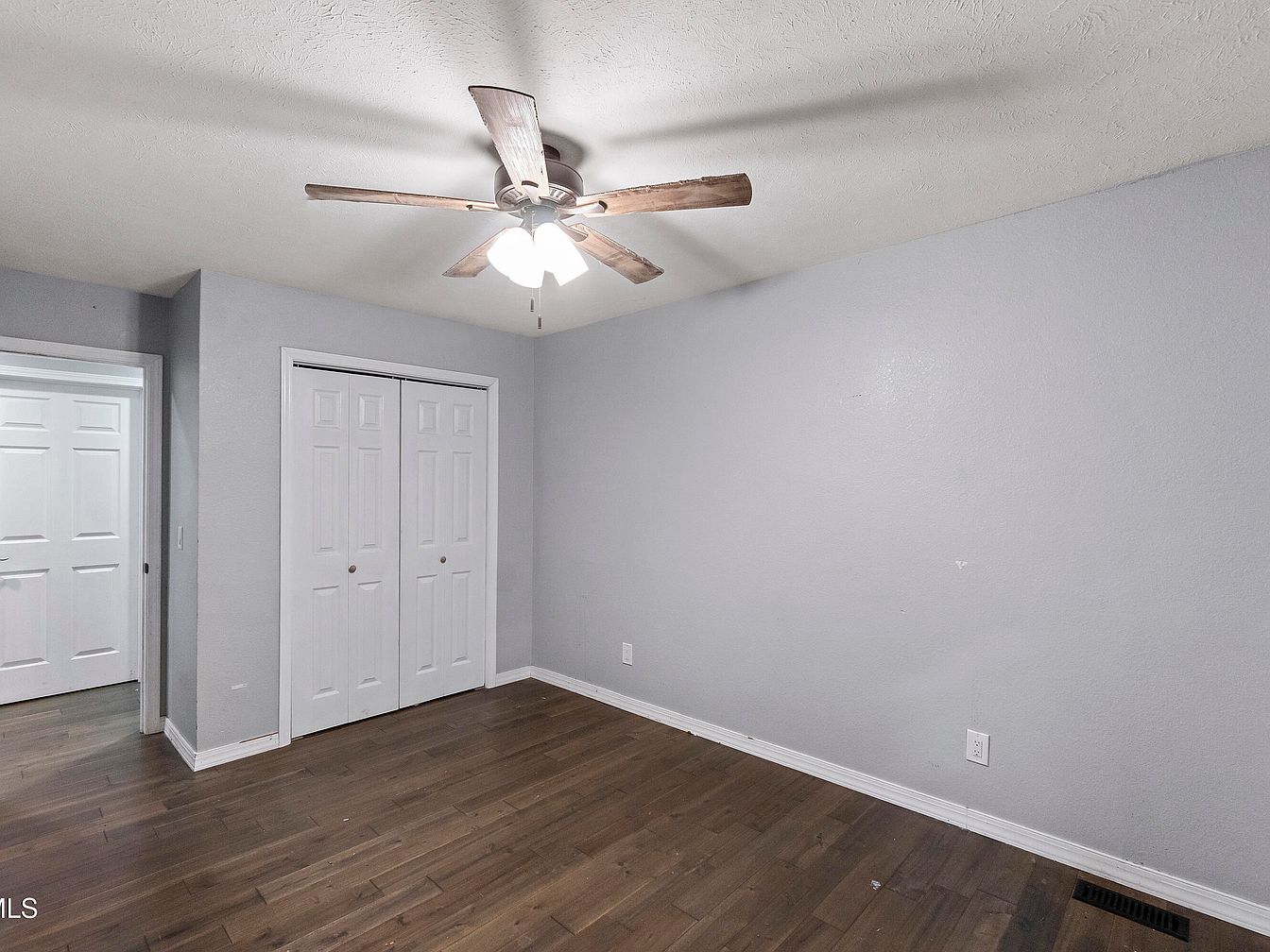 This bedroom features a calming neutral palette with soft gray walls paired with warm, medium-toned hardwood flooring. The ceiling is textured and accented with a rustic ceiling fan with distressed wooden blades and integrated lighting, adding both character and functionality. A double white-paneled closet door provides ample storage space, and white baseboards frame the room neatly. The layout is simple and open, allowing versatility in furniture arrangement. White trim around the doorway complements the closet doors, creating a clean and cohesive look that balances modern and rustic design elements.