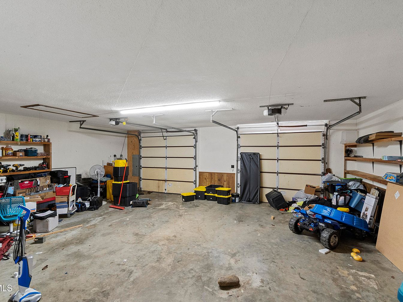 This spacious two-car garage features beige sectional overhead doors with metal framing and an unfinished concrete floor marked by typical garage use wear. The walls are painted a simple white, providing a neutral and functional backdrop. On one side, various shelving units hold an assortment of items including tools, bins, and cleaning supplies, while scattered storage bins and a mop suggest a multipurpose space for organization and maintenance. Industrial-style fluorescent lighting illuminates the area, while additional shelving on the opposite wall offers further storage. The layout emphasizes practical utility over decor, typical of a working garage setting.
