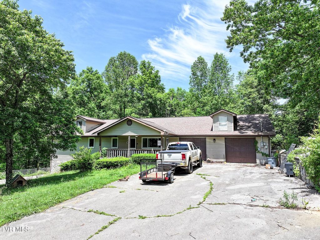 This custom-built home in Cosby, Tennessee, offers a blend of traditional and ranch-style architecture characterized by its wide layout and gabled roof with dormer windows. The residence features 4 bedrooms and 2 bathrooms within an open concept floor plan that emphasizes spacious and flexible living areas. Built with functionality in mind, the home includes a substantial additional garage space totaling over 3,500 square feet, perfect for vehicles, storage, or a workshop. Set on over 7 acres of lush, wooded land, the property enjoys a natural creek along the back boundary, providing a serene backdrop and opportunities for outdoor exploration and childhood adventures. The fenced backyard is thoughtfully split into two sections, enhancing privacy and versatility for various outdoor activities. Though the home requires some TLC and is sold as-is with no repairs by the owner, its price of $519,000 reflects the market value for its size and acreage, presenting significant potential for customization and improvement.