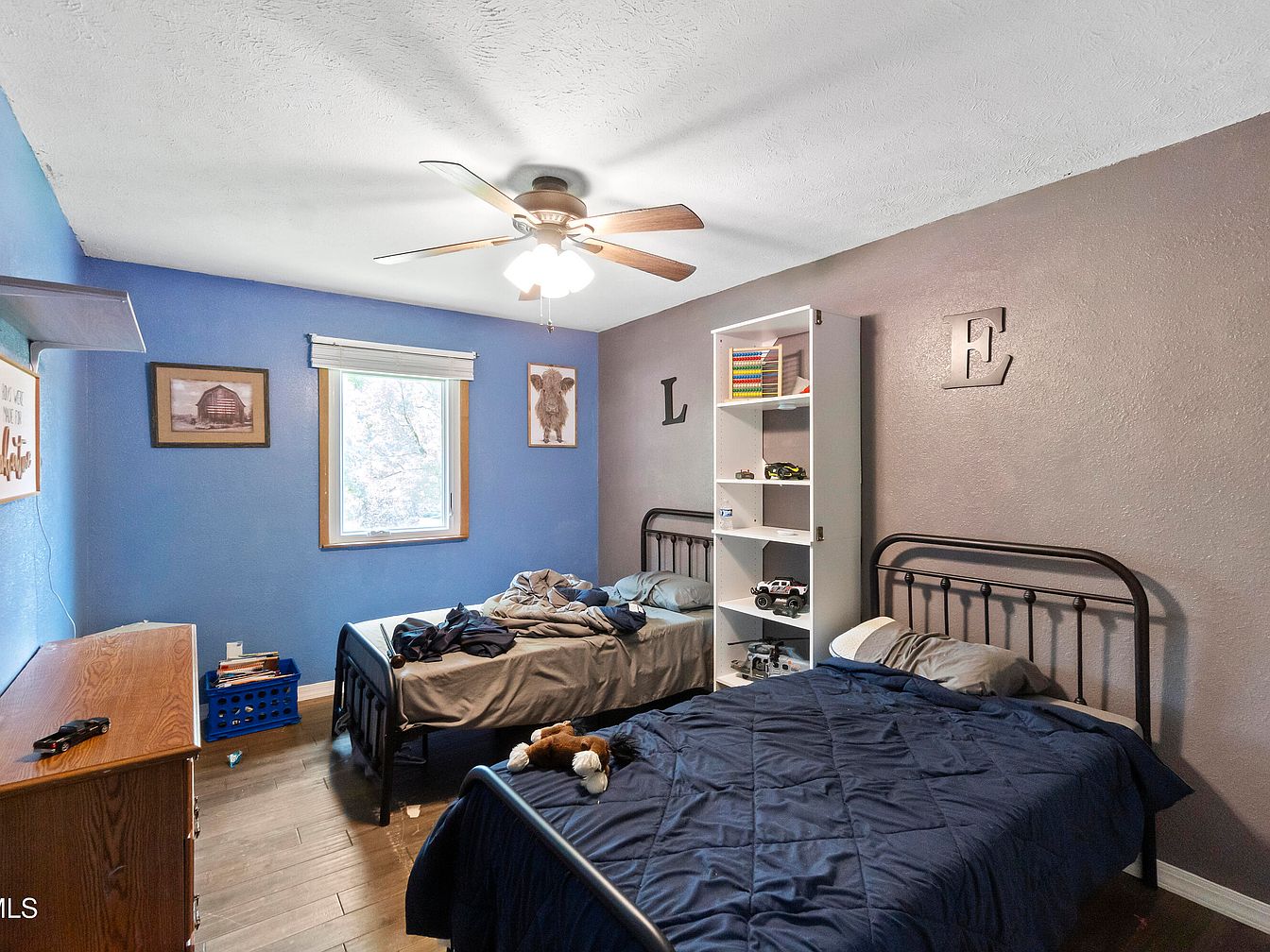 This cozy shared bedroom features two twin metal-framed beds positioned along adjacent walls, fostering a sense of personal space within a shared environment. The far wall is painted a calming blue, contrasted by a muted gray on the side wall, adding depth to the room’s color scheme. Between the beds, a white open shelving unit holds toys and books, serving both storage and decorative purposes. The hardwood flooring brings warmth, complemented by a ceiling fan with wooden blades providing functional airflow. Framed artwork and letter decor enhance the room’s inviting, personalized atmosphere.