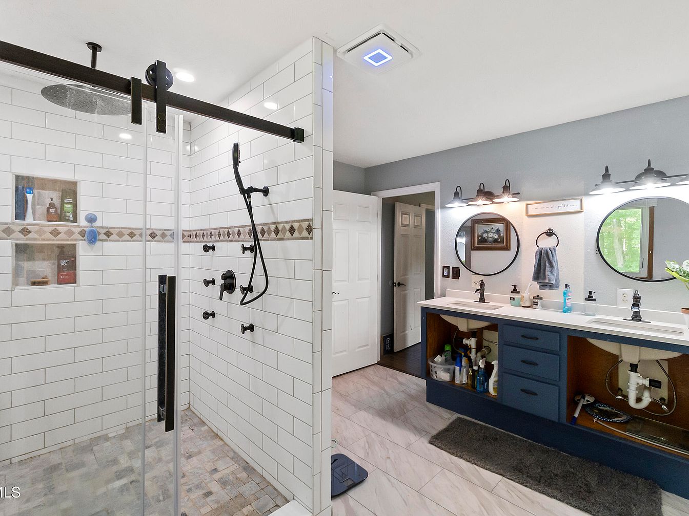 This bathroom features a modern and functional layout with a prominent double vanity against a soft gray wall. Two round mirrors, each illuminated by black vintage-style sconces, add elegance above the white countertop. The navy blue vanity cabinets, currently open to reveal plumbing and storage, introduce bold contrast and storage potential. Adjacent is a spacious walk-in shower with glass sliding doors and crisp white subway tiles accented by a decorative horizontal strip of earthy diamond tiles. The shower floor is tiled in neutral, multi-toned stone tiles that complement the polished marble-look floor tiles throughout the space. Overall, the design combines modern fixtures and rustic accents for a clean, welcoming feel.
