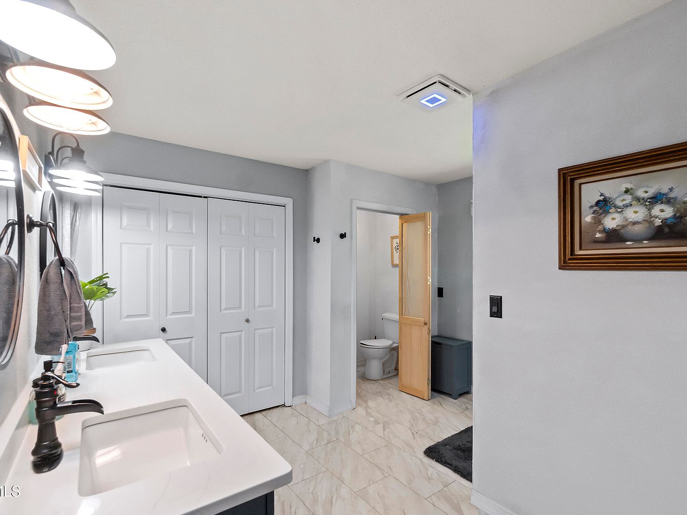 This bathroom features a clean and modern design with a neutral color palette dominated by light gray walls and glossy beige marble floor tiles. A double vanity with sleek rectangular sinks and matte black faucets enhances functionality, accompanied by large round mirrors and industrial-style wall-mounted light fixtures that provide ample illumination. White bi-fold closet doors are positioned opposite the vanity, offering practical storage solutions. Beyond, a partially open wooden door reveals a separate toilet area, maintaining privacy while contributing to the room’s spacious feel. A framed floral painting on the wall adds a touch of color and elegance to the simple, calm ambiance.