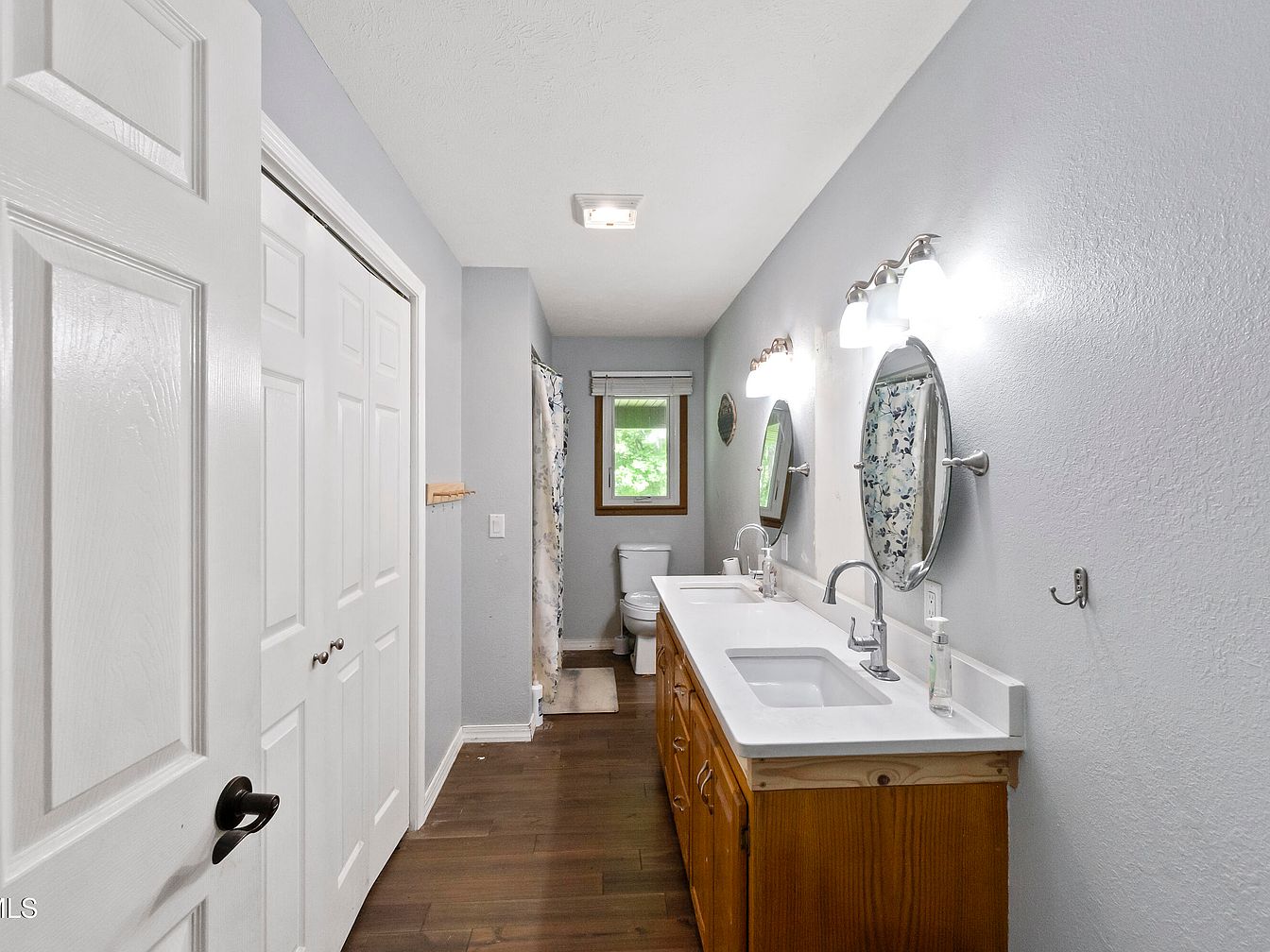 This bathroom features a long wooden vanity with two inset sinks and modern silver faucets. Above each sink hangs an oval mirror accented by synchronized wall-mounted light fixtures, providing ample illumination. The walls are painted a soft gray that complements the darker wood flooring, creating a calm and cohesive atmosphere. At the far end, a small window with a wooden frame allows natural light to filter in, just above a white toilet. To the left, white double doors likely conceal storage or a linen closet, while a shower with a floral-patterned curtain sits adjacent to the window. The overall design balances practicality with subtle warmth and neutral tones.