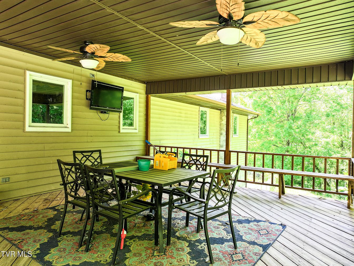This covered outdoor patio space features a comfortable seating arrangement with a black metal dining table and six matching chairs, set atop a decorative area rug with intricate patterns in muted earth tones. The ceiling is finished in a warm brown with two ceiling fans that have leaf-shaped blades, adding a tropical touch. The beige siding walls complement the natural wood flooring and bench railing that lines the open side, offering views of lush greenery beyond. A wall-mounted flat-screen TV adds entertainment options, making this an inviting space for relaxing and dining outdoors.