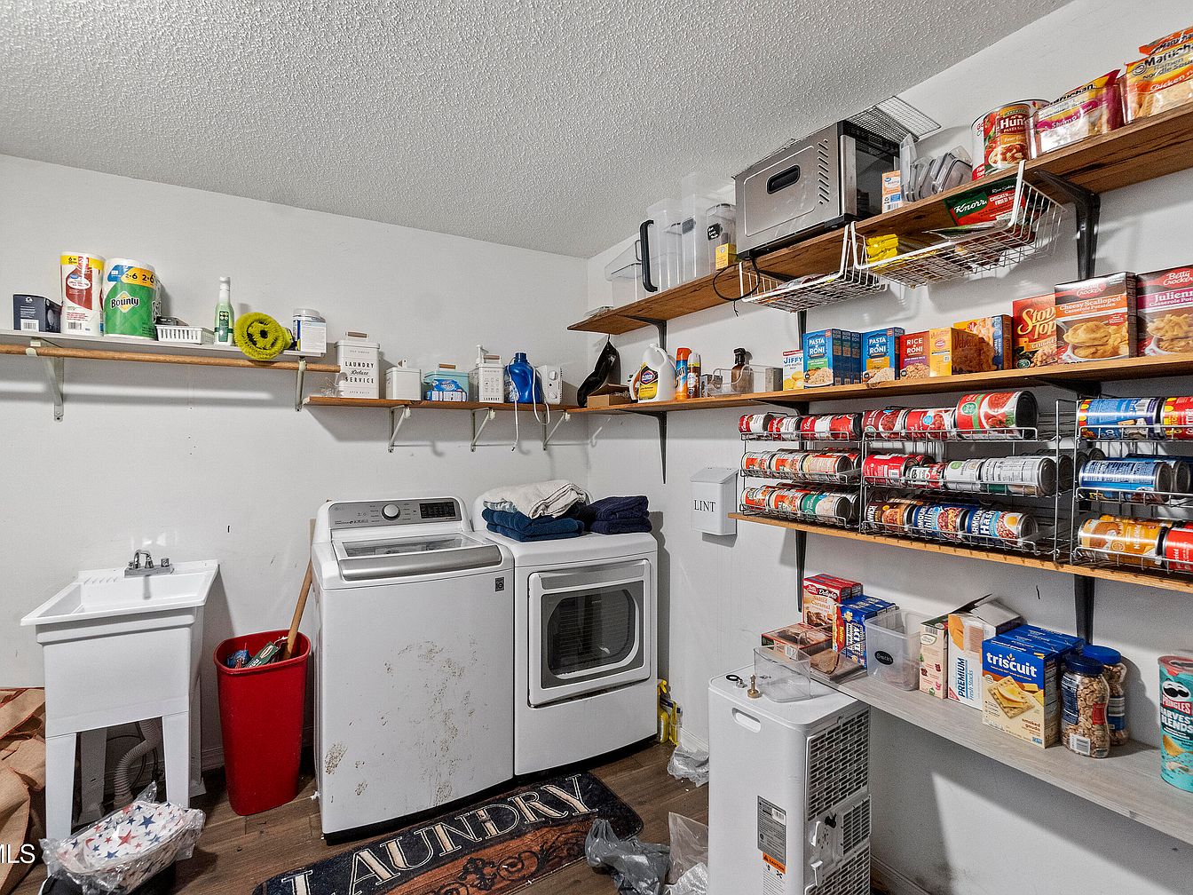 This combined laundry and pantry area is efficiently organized, featuring a white washer and dryer set centered beneath wooden shelving that lines two walls. Above the machines, towels are neatly folded, and shelves are stocked with various pantry staples, including canned goods and boxed mixes, neatly arranged in wire racks and on open wood shelves. The walls are painted a clean white, enhancing brightness, while the brown hardwood floor adds warmth. A utility sink sits to the left, next to a red trash bin. Overall, the room balances function and order, creating a practical space for household chores and storage.