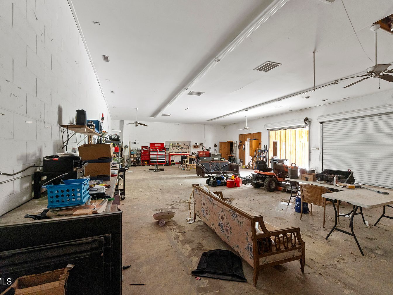 This expansive workshop showcases a large open floor plan with concrete floors and white painted cinder block walls that impart an industrial, utilitarian feel. The high ceiling is equipped with long fluorescent light fixtures and ceiling fans, providing ample illumination and ventilation for active workspace needs. Various workbenches and tool storage units are neatly arranged along the far wall, including prominent red tool chests and shelving units filled with equipment. Mixed-use furniture such as an upholstered vintage couch and folding tables indicate a multifunctional area where work meets casual comfort. The presence of lawn equipment and garage roll-up doors suggests easy accessibility for outdoor maintenance tasks.