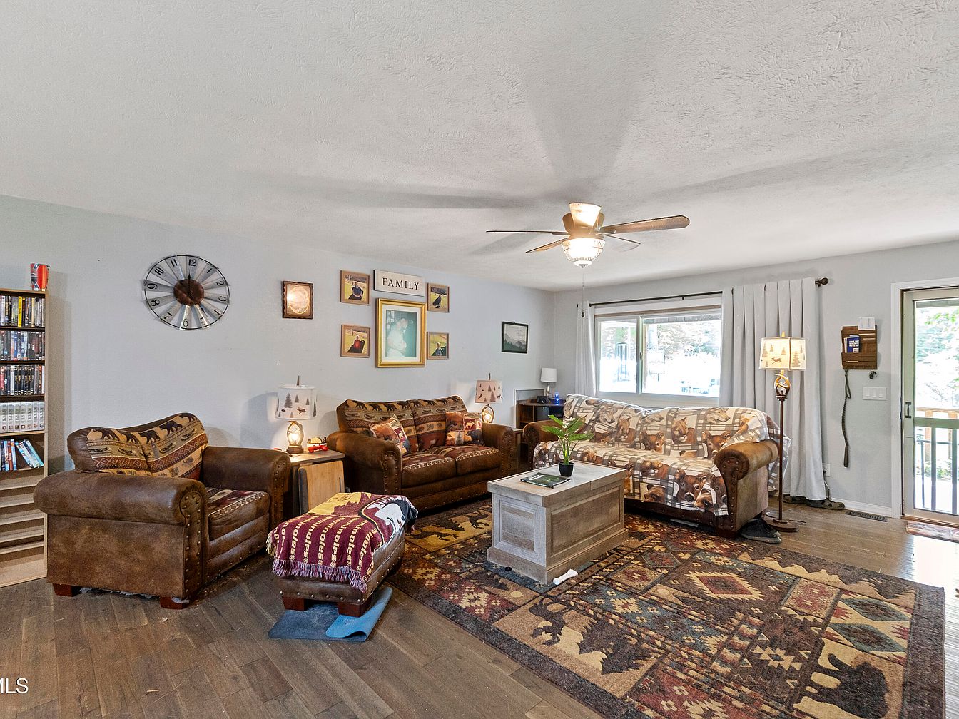 This living room exudes a cozy, rustic charm with earth-toned leather furniture and nature-inspired fabric patterns. The seating arrangement includes a large sofa and armchair, both complemented by an ottoman covered in a warm, patterned throw. The centerpiece is a sturdy, wooden coffee table resting on a richly patterned area rug that anchors the space. Walls are painted light gray, offering a neutral backdrop for family photos arranged above the couch, topped by a “FAMILY” sign. Natural light filters through large windows dressed in simple curtains, while a ceiling fan provides overhead lighting and air circulation. Additional details include a standing lamp with a decorative, nature-themed shade and a wall clock, enhancing the welcoming atmosphere.