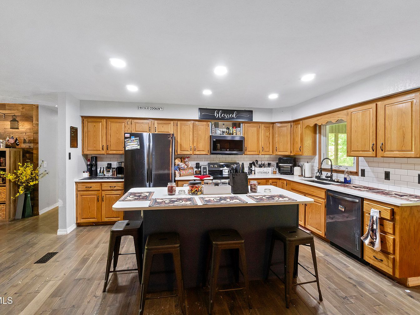 This spacious kitchen centers around a large island with a white countertop contrasting the dark base, surrounded by four industrial-style metal stools offering casual seating. The cabinetry is honey oak with simple black hardware, creating a warm and inviting atmosphere. Stainless steel appliances, including a double-door refrigerator and dishwasher, blend seamlessly with the classic white subway tile backsplash. Recessed ceiling lights provide ample illumination, while windows above the sink introduce natural light. The rustic wood-tone flooring complements the wood cabinets, enhancing the cozy, functional, and well-organized space for cooking and gathering.