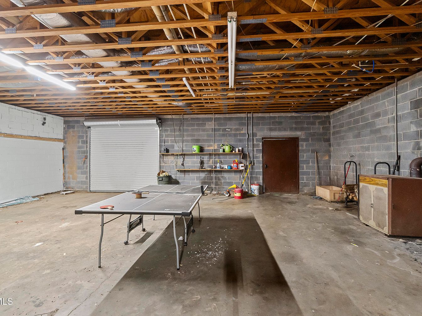 This spacious basement features exposed wooden beam ceilings and concrete block walls, giving it an industrial, unfinished aesthetic. The floor is bare concrete, suited for casual use or activities. The room includes a ping pong table as a centerpiece, highlighting a recreational purpose. On one side, a large white rolling door suggests easy access for storage or larger items. Shelving units mounted on the back wall hold various small items, while tools and equipment are visible, enhancing the utility feel. The muted earth tones and raw materials emphasize practicality over decor.