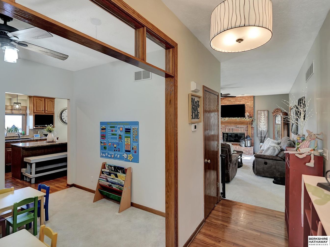 This section of the home features a transition from warm hardwood flooring in the hallway to plush carpeting in the living space, creating a cozy yet refined ambiance. The hallway is accented by a red cubby storage unit adorned with decorative pieces, adding a pop of color against the neutral beige walls. Through the hallway, glimpses of a comfortable living area with reclining sofas facing a brick fireplace establish a welcoming setting. The space has natural light, wood-trimmed doorways, and a bathroom with dark tile flooring and a white shower curtain visible at the end of the corridor, enhancing the functional flow and homey vibe.