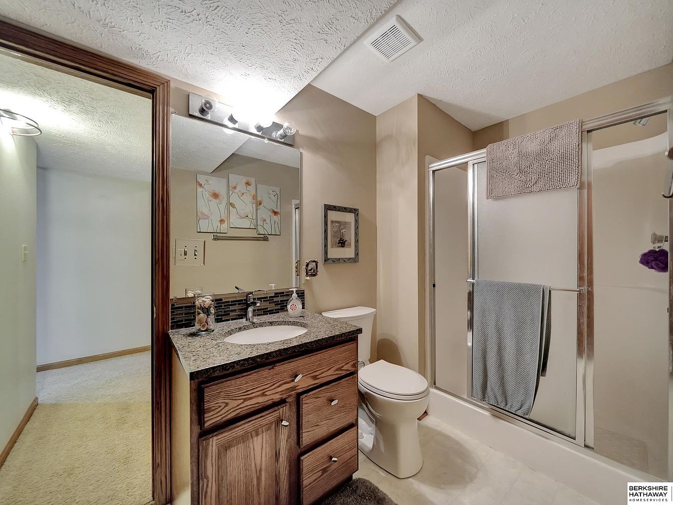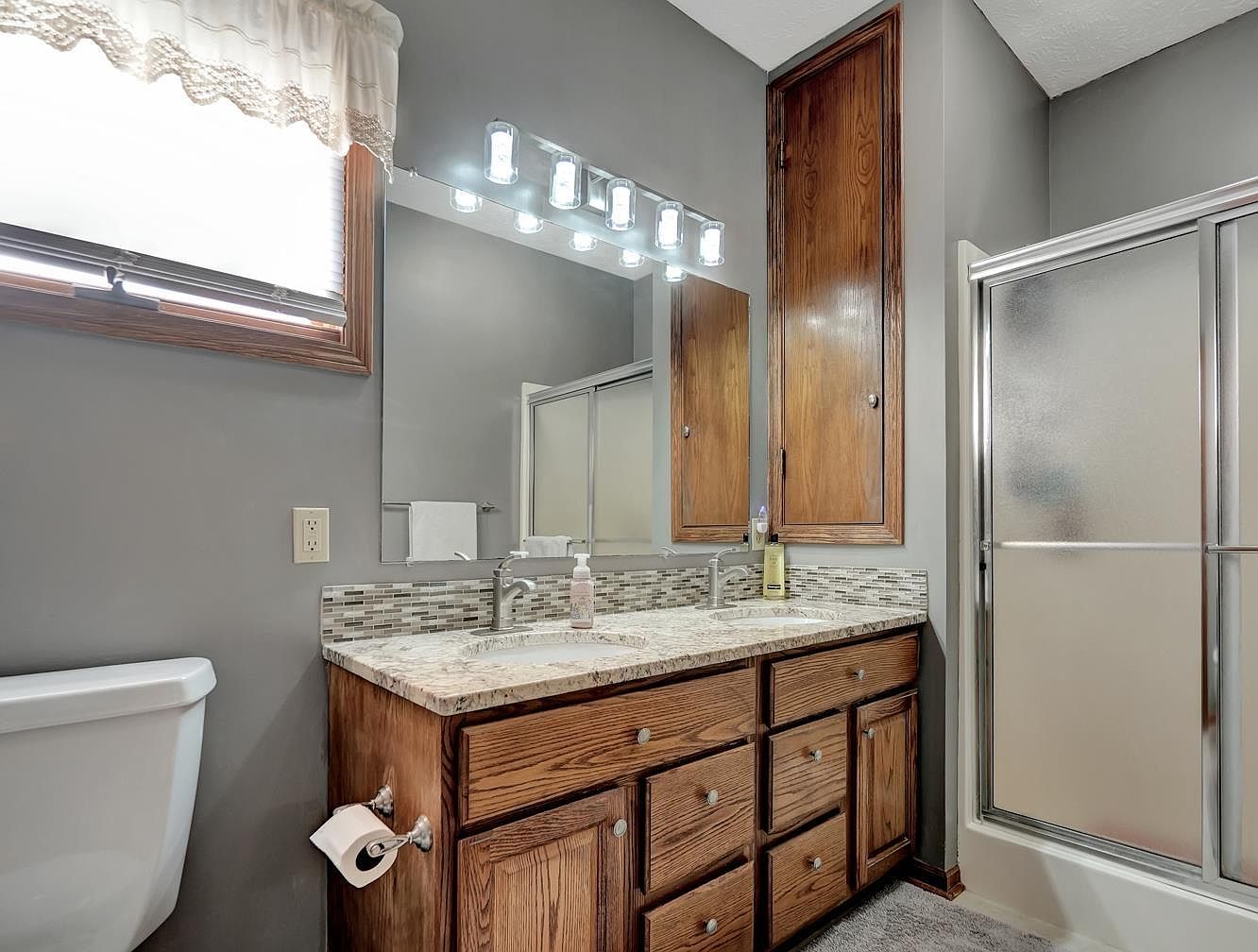 This cozy bathroom features a classic design with warm neutral walls and a textured ceiling. The vanity is crafted from medium-toned wood with a granite countertop housing a white oval sink and modern chrome faucet. Above the vanity, a large mirror stretches to reflect light from the bright fixture fitted with multiple bulbs. A delicate black-and-gray glass backsplash runs behind the sink, adding subtle color contrast. Opposite the vanity, a white toilet sits next to a built-in shower with sliding glass doors framed in chrome. Soft-colored towels add a touch of calm and practicality to the space, complemented by small floral artwork on the walls. The overall aesthetic balances functional simplicity with warm tones and natural textures.