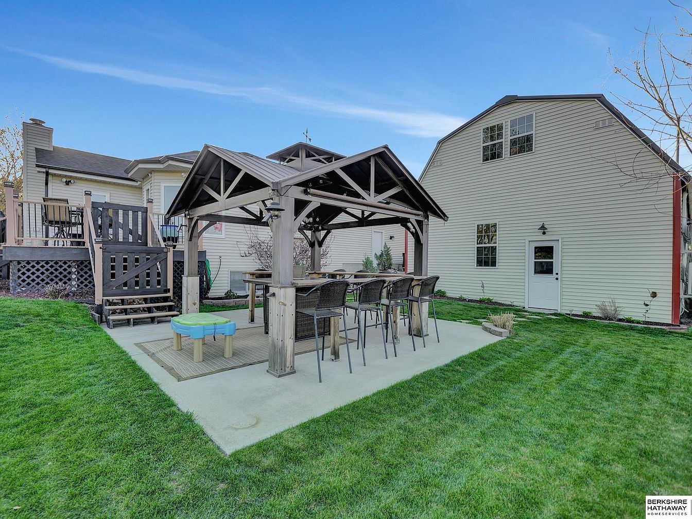 This serene backyard features a well-manicured lawn with a concrete patio area centered beneath a wood-framed gazebo. The gazebo has a peaked roof with exposed beams, offering a stylish yet functional outdoor dining space with high-backed wicker chairs arranged around a wooden table. Adjacent to the patio is a raised wooden deck accessed by stairs, which connects to the house. The siding of the home and detached structure is light-colored, complementing the natural wood tones of the outdoor furniture. Subtle landscaping adds to the relaxed, inviting atmosphere perfect for gatherings.