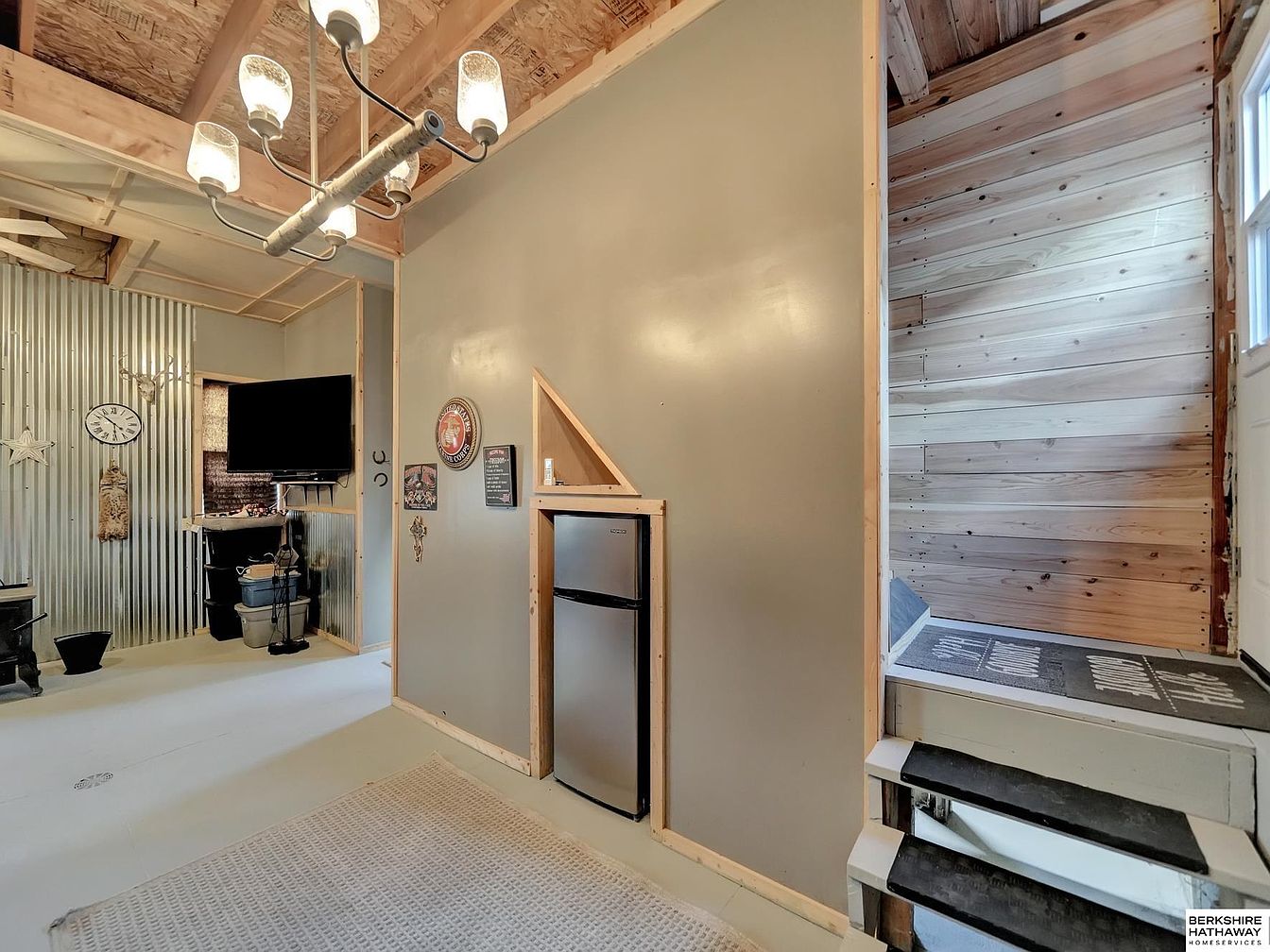 This cozy basement lounge displays a blend of rustic and industrial design elements, featuring natural wood framing with exposed ceiling beams. A small stainless steel mini fridge is neatly inset into the wall, surrounded by trim that adds a custom, built-in feel. The adjacent steps lead to a wood-paneled entryway accented with horizontal planks and a small window, inviting natural light. Corrugated metal paneling on the far wall contrasts with the smooth, muted sage-green paint on the surrounding surfaces, enhancing the industrial vibe. A modern chandelier with glass shades illuminates the space, while wall decor adds a personal, eclectic touch.