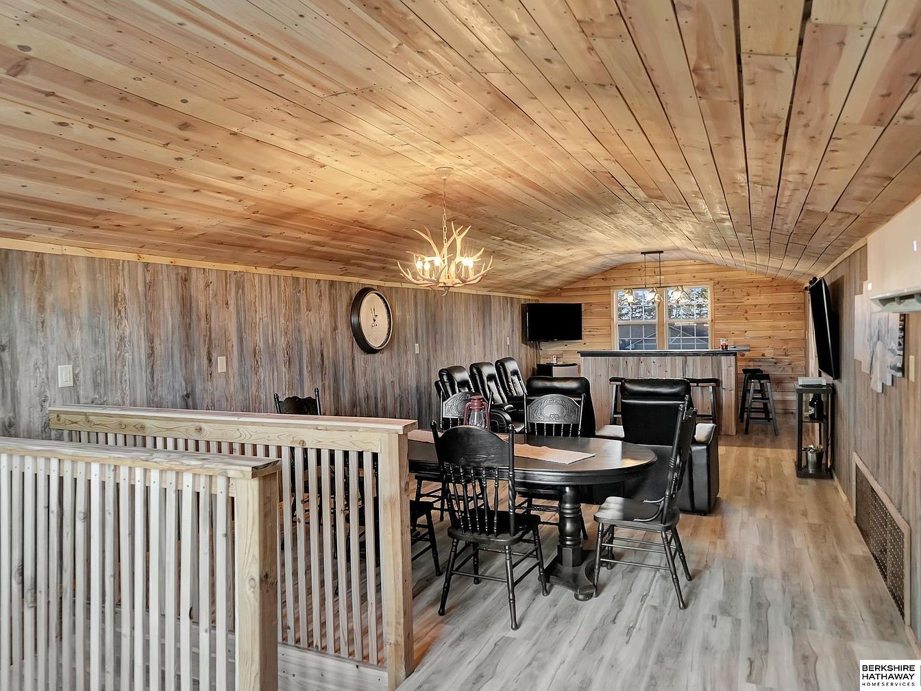 This spacious loft area combines rustic charm with modern comfort through its extensive use of natural wood paneling on the ceiling and walls, evoking a cozy cabin feel. The light wood ceiling contrasts softly with the grayish wood-paneled walls and matching light-toned flooring, creating a warm yet neutral palette. A large round black dining table with six classic spindle-back chairs anchors the foreground, ideal for gatherings. Beyond, a row of black leather recliner chairs faces a wall-mounted TV, perfect for entertainment. An open bar with stools sits below a window at the far end, contributing to the inviting social atmosphere. A unique antler-themed chandelier adds a rustic decorative touch above the dining area, while simple railings protect the stairwell opening, blending safety with style.