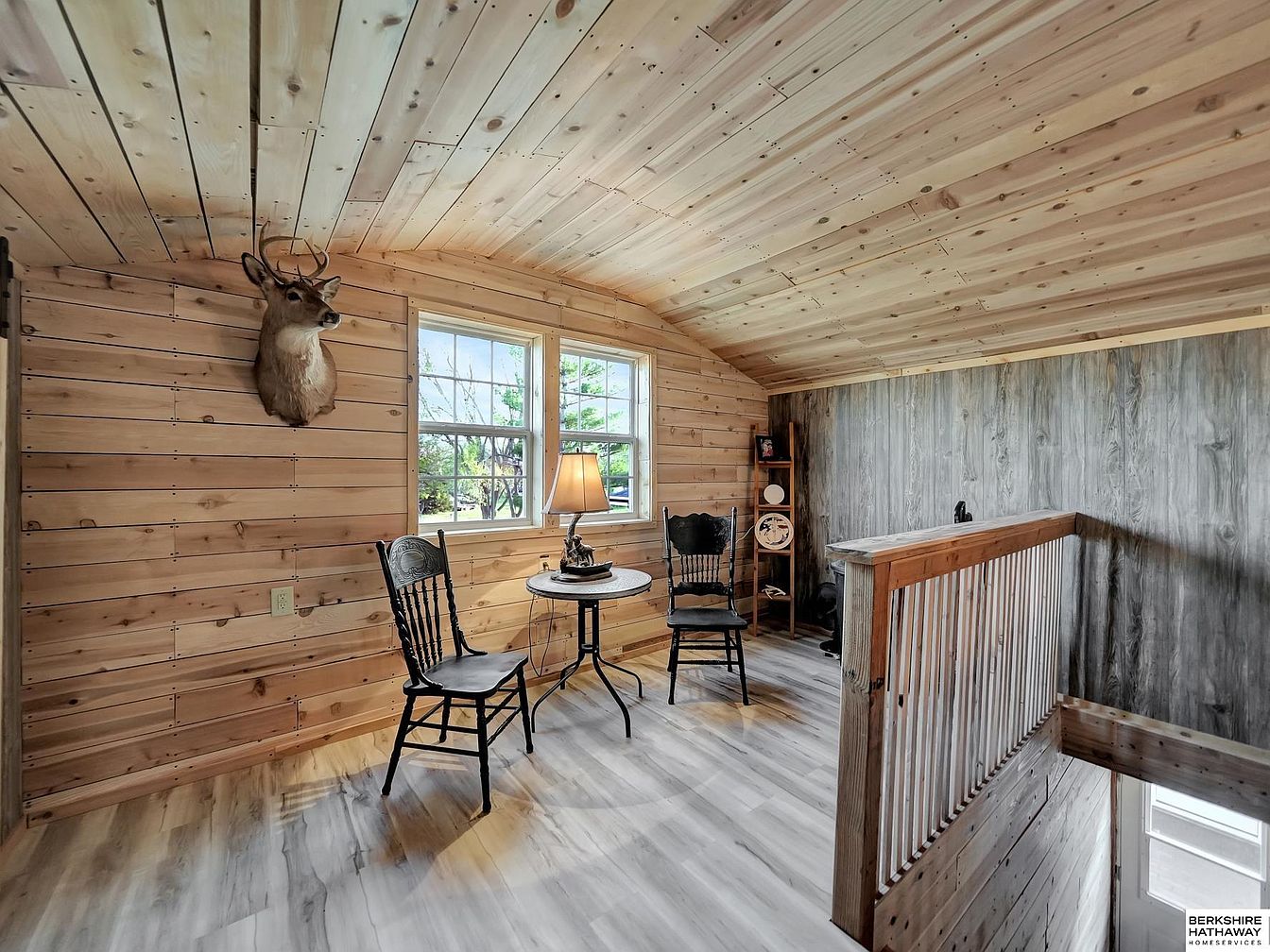 This loft features warm, natural wood paneling on the walls and ceiling, creating a rustic cabin ambiance. Two black spindle-back chairs flank a small round table topped with a decorative lamp, providing a quaint spot for conversation or reading. The light-colored, textured flooring contrasts subtly with the darker accent wall and railing, which frames a staircase below. A mounted deer head adds a traditional hunting lodge touch. The double window brings in natural light, enhancing the welcoming, relaxed feel of this compact upper-level nook.