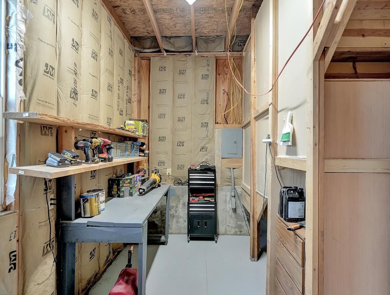 This compact workshop space features exposed insulation on the walls and an open ceiling showcasing wooden beams and electrical wiring, emphasizing its utilitarian function. A grey workbench runs along one side, holding various tools including drills and other power equipment, organized neatly on wooden shelves above. The floor is a smooth, painted concrete, enhancing durability and ease of maintenance. A black metal tool chest on wheels is positioned at the end, providing additional storage. The overall design prioritizes practicality with unfinished surfaces and accessible utility elements, suited for crafting or home repair projects.