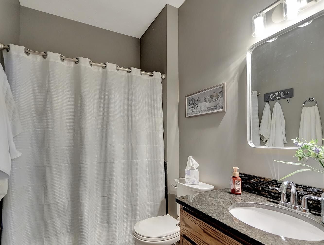 This bathroom features a compact yet functional layout, combining neutral tones for a calm and clean atmosphere. A crisp white shower curtain with a subtle texture hangs from a stainless steel rod, contrasting softly with light taupe walls. The vanity boasts a dark granite countertop with a sleek oval sink and silver faucet, complemented by a wooden cabinet base that adds warmth. Above, a large mirror framed by soft lighting illuminates the space, reflecting a decorative sign and neatly hung white towels. Small decorative accents like a tissue box and soap dispenser add a touch of practicality and homely charm.