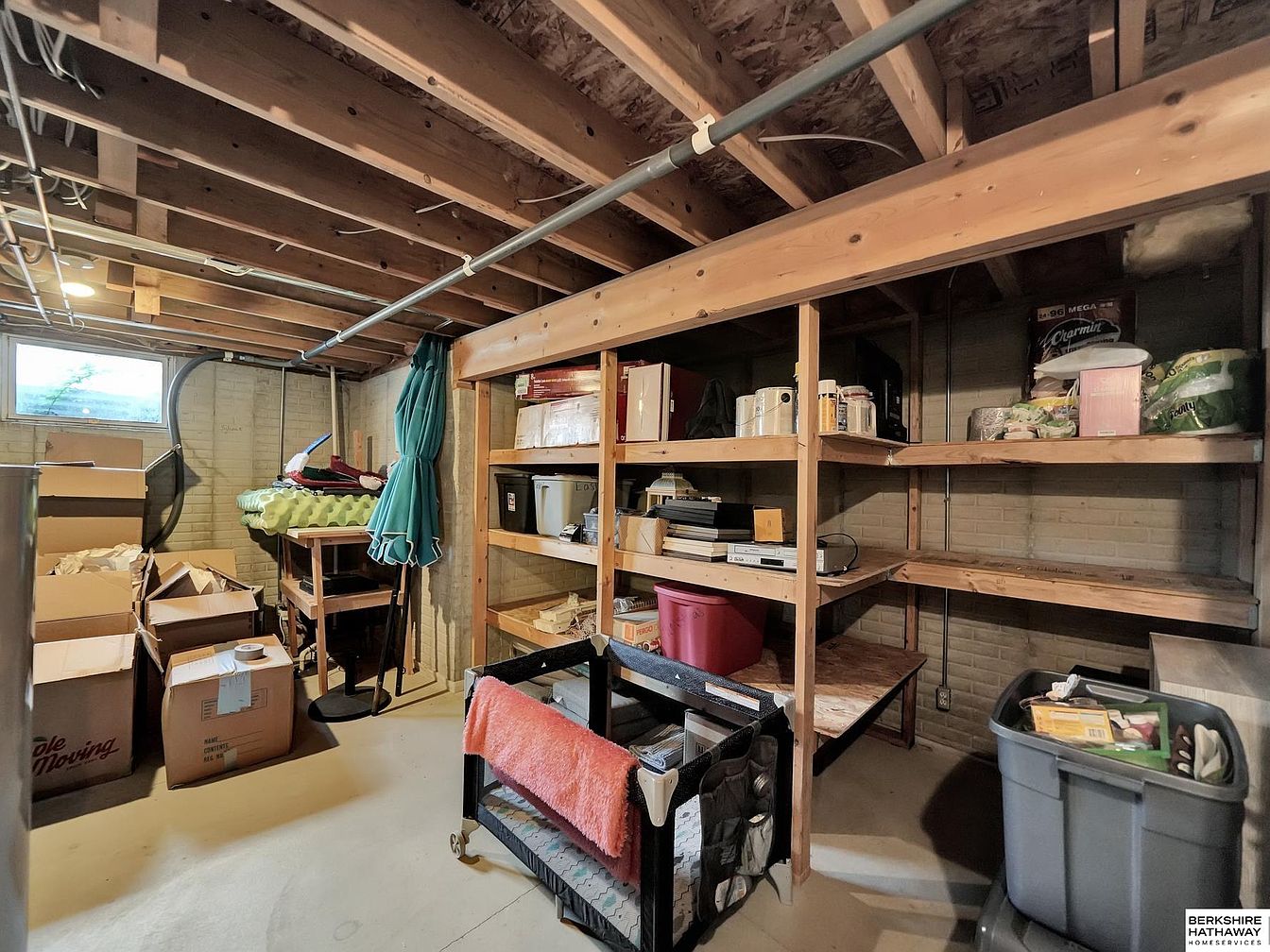 This basement storage space features exposed wooden ceiling beams and a neutral concrete floor that emphasize its utilitarian nature. The walls are made of light gray cinder blocks, which add to the unfinished, functional aesthetic. Along one wall, wooden shelving units provide ample storage, holding various household items such as paint cans, paper goods, and boxes. A small window near the ceiling allows some natural light in, brightening the space slightly. The area also contains packed boxes, an umbrella, and a portable playpen with a coral-colored blanket draped over it, reflecting practical everyday storage usage.