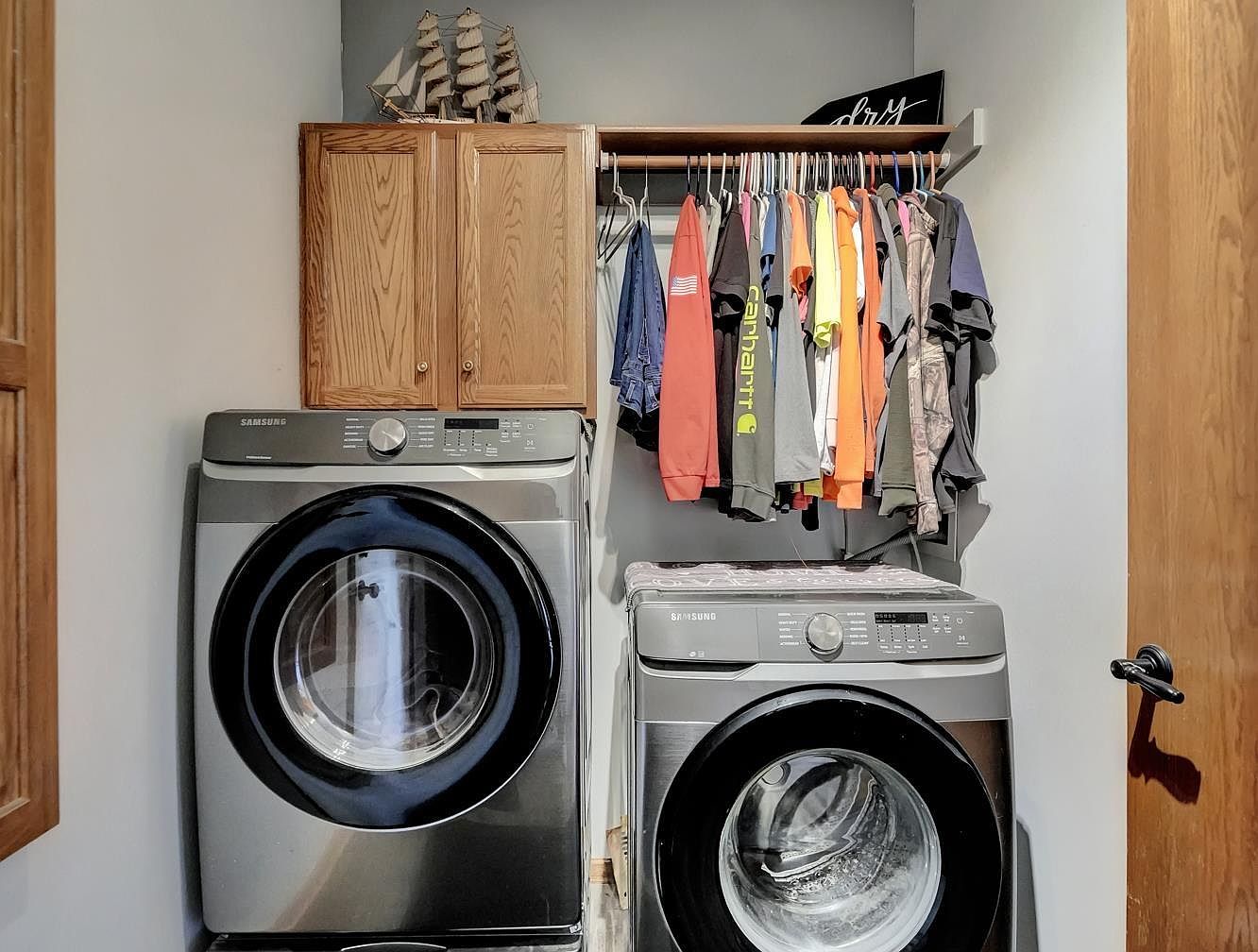 This compact laundry space is thoughtfully arranged with modern Samsung front-loading washer and dryer units in a sleek metallic finish, providing a contemporary touch. Above the machines, a wooden cabinet offers practical storage while a shelf extends to hold a hanging rod with an array of colorful clothes on hangers, adding vibrancy and functionality. The walls are painted a soft neutral tone, complementing the natural wood of the cabinetry and door, creating a warm, inviting atmosphere in this efficient utility area designed for everyday convenience.