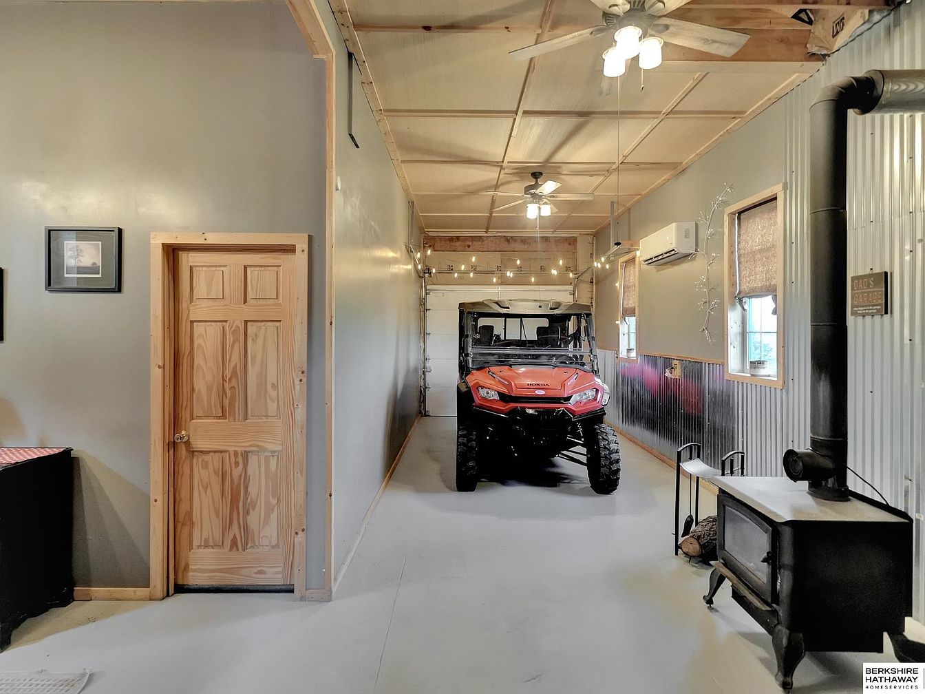 This garage features a spacious, elongated layout with a high ceiling framed by exposed wooden beams that add rustic charm. The walls combine smooth gray paint with corrugated metal paneling, blending industrial and farmhouse aesthetics. A large orange utility vehicle is parked centrally, emphasizing the garage’s practical use. On one side, a classic black wood stove with a metal pipe provides a cozy heating option, complemented by neatly stacked firewood and fireplace tools. Two small windows with woven shades allow natural light while preserving privacy. Ceiling fans and string lights enhance functionality and ambiance.