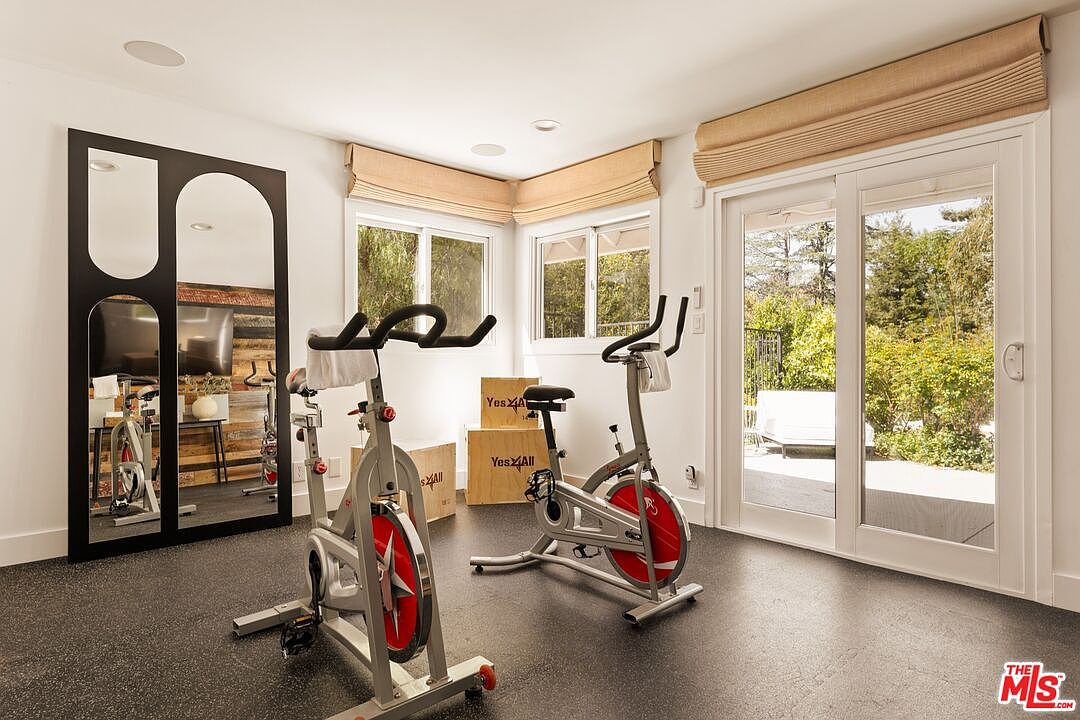 This home gym features a bright and airy layout with natural light flooding in from two windows and large glass sliding doors that open to an outdoor area. The walls are painted a crisp white, creating a clean and fresh atmosphere, complemented by beige Roman shades that soften the sunlight. The room contains two modern stationary bikes with sleek silver and red accents, positioned on a dark rubberized gym floor that provides practicality and comfort. A tall, black-framed mirror with unique rounded and rectangular cutouts adds a stylish design element while reflecting light and space. The overall aesthetic combines functionality with subtle contemporary touches for an inviting workout environment.