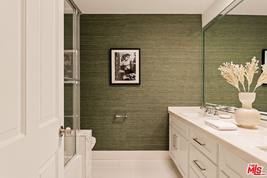 This bathroom features a modern and clean design with a long white vanity countertop and integrated sinks, accented by sleek silver fixtures. The cabinetry underneath is pristine white with contemporary horizontal handles, offering ample storage space. The dominant olive green textured wall behind the vanity creates a calm, natural atmosphere. A large mirror spans the entire length above the countertop, enhancing the sense of space and light. A tasteful black-and-white photograph is centered on the wall, adding artistic interest. Neutral beige floor tiles complement the overall muted and sophisticated color scheme. A minimalist vase with dried floral stems sits on the counter, providing a subtle touch of elegance.