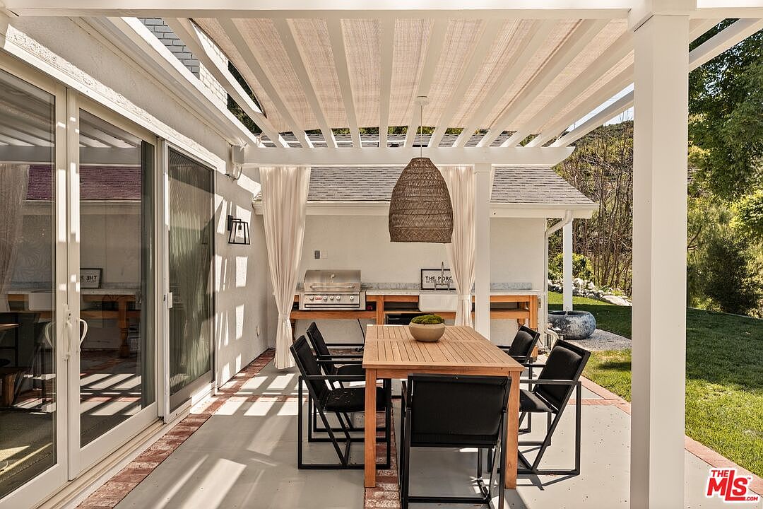 This covered patio features a clean, inviting outdoor dining area with a modern yet natural aesthetic. A rectangular wooden table with black-framed chairs anchors the space, offering seating for six. The pergola overhead with white beams creates gentle shadows, enhancing the sense of openness. Light, sheer curtains hang from rods, offering optional privacy and shade. The far wall includes a built-in countertop and stainless steel grill, perfect for outdoor cooking and entertaining. Neutral colors dominate, with white walls, soft gray flooring, and natural wood tones, balanced by greenery visible just beyond the patio’s edge, adding warmth and freshness.