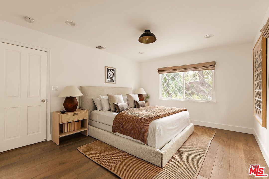 This serene bedroom showcases a minimalist design favoring neutral tones and natural textures. A low-profile upholstered bed with an array of plush pillows anchors the space, layered over a woven natural fiber rug that adds warmth to the hardwood flooring. Light cream walls enhance the room’s airy feel, complemented by masonry-style windowpanes with diamond patterns, bringing in ample natural light. Matching nightstands flank the bed, topped with rustic ceramic lamps with neutral shades. Subtle art pieces and a simple ceiling light fixture complete the calm, cohesive aesthetic of this restful retreat.