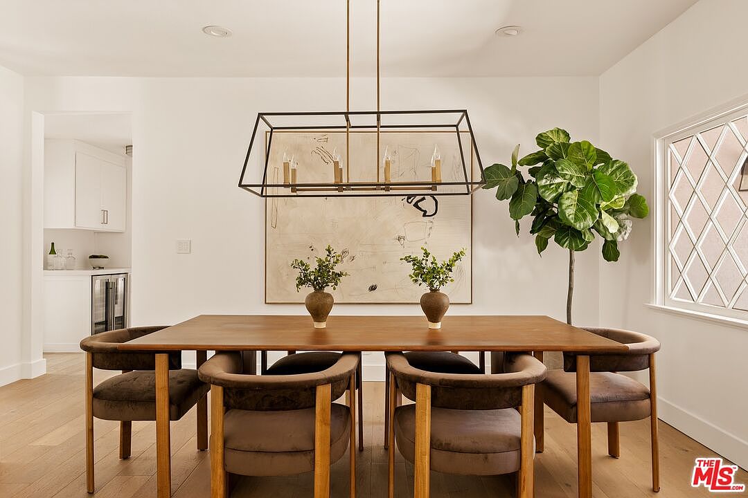 This dining area features a sleek, rectangular wooden table paired with six cushioned chairs covered in soft, muted brown upholstery, creating a warm and inviting setting. Above the table hangs a large, geometric metal-framed chandelier with exposed bulbs, serving as a modern focal point. The space is painted in crisp white, enhancing the natural light streaming through the diamond pattern window to the right. A large, abstract neutral-toned artwork anchors the far wall, while two simple earthenware vases with green sprigs add organic touches. A tall, leafy indoor plant in the corner contributes vibrant greenery and freshness to this minimalist yet elegant dining space.