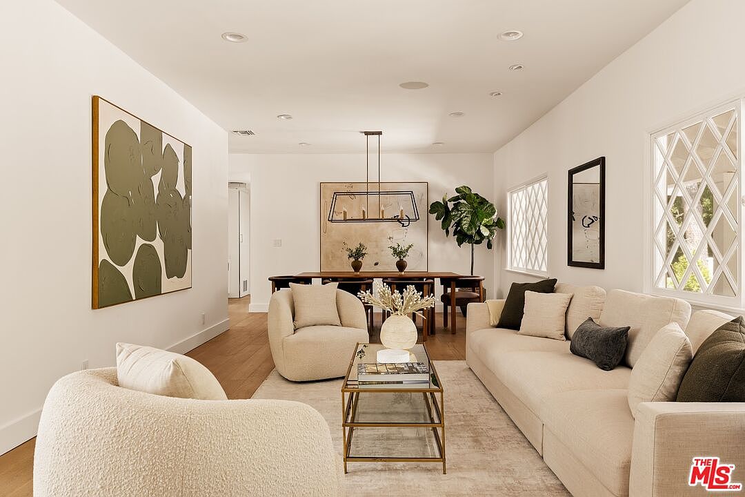 This open-concept living and dining area is designed with a neutral palette dominated by soft creams, beige, and subtle earthy greens. The living room features a plush, curved armchair and a long, comfortable sofa adorned with a variety of pillows in cream and muted green tones. A sleek glass coffee table with a gold frame sits atop a neutral rug, anchoring the space with delicate elegance. The dining area beyond consists of a sturdy wooden table accompanied by matching chairs, topped with simple floral decor. Large windows with diamond-patterned framing let in natural light, complimenting modern wall art and a leafy plant that add warmth. Recessed ceiling lights and a geometric pendant fixture over the dining table enhance the calm, contemporary ambiance.