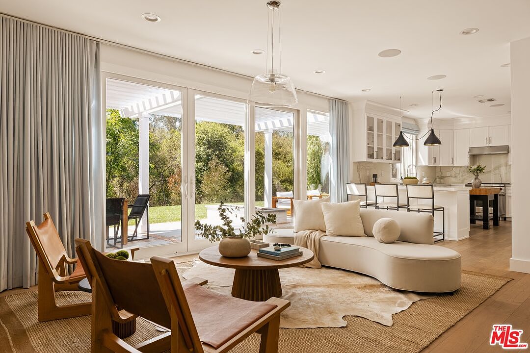 This open-concept living and kitchen area highlights a modern, airy design with a neutral color palette of soft beige, white, and natural wood tones. The living room features a curved cream sofa adorned with matching pillows and a throw, positioned on a layered rug with both a natural fiber base and a subtle animal hide on top. Two wooden frame lounge chairs with woven seats complement the round wooden coffee table, which hosts a minimalist vase and books. Floor-to-ceiling glass doors offer abundant natural light and connect the space to the outdoor patio, framed by sheer gray drapes. The kitchen features white cabinetry, a peninsula with barstools, and black pendant lights that contrast elegantly with the overall light atmosphere. Light wood flooring unifies the entire space, emphasizing a warm but contemporary aesthetic.