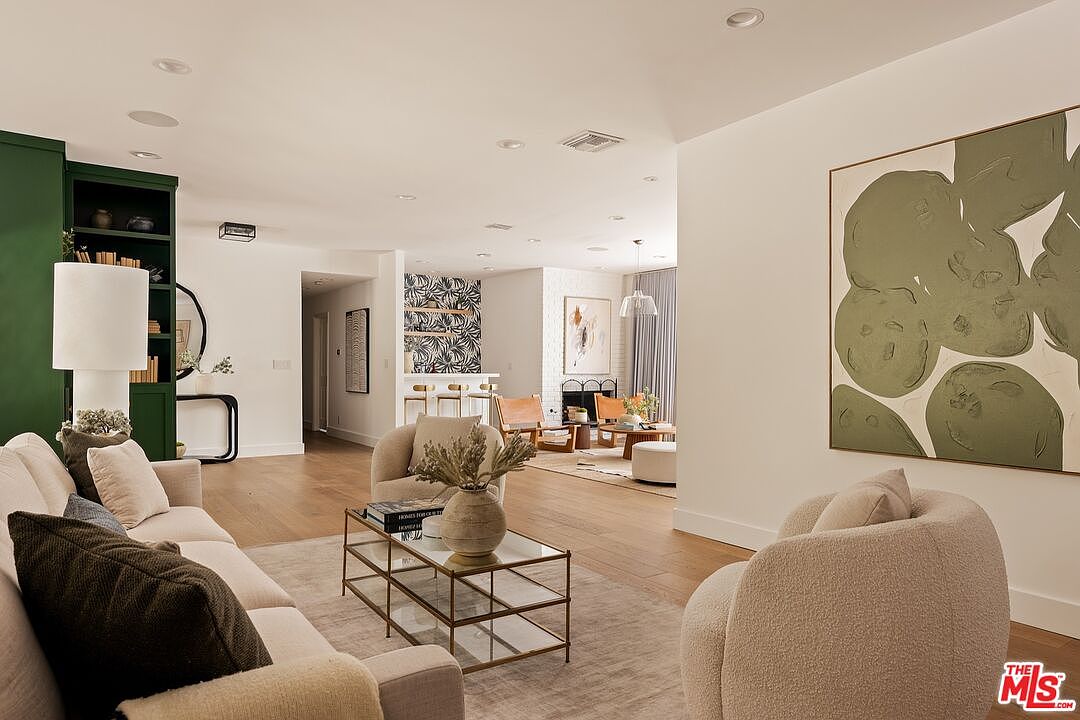 This serene living room features a sophisticated blend of neutral tones and natural textures, with a creamy beige sofa and matching plush armchairs centered around a glass coffee table with a gold metal frame. The light wood flooring extends throughout, enhancing the room’s warmth and openness. A deep green built-in bookshelf adds a bold accent wall, contrasting the otherwise soft color palette. The space flows seamlessly into a cozy sitting nook with leather chairs and a small wooden table, highlighted by tropical-themed wallpaper and modern, minimalist decor. Statement abstract art emphasizes the clean, contemporary aesthetic. The overall design balances comfort and style with subtle greenery and layered lighting.