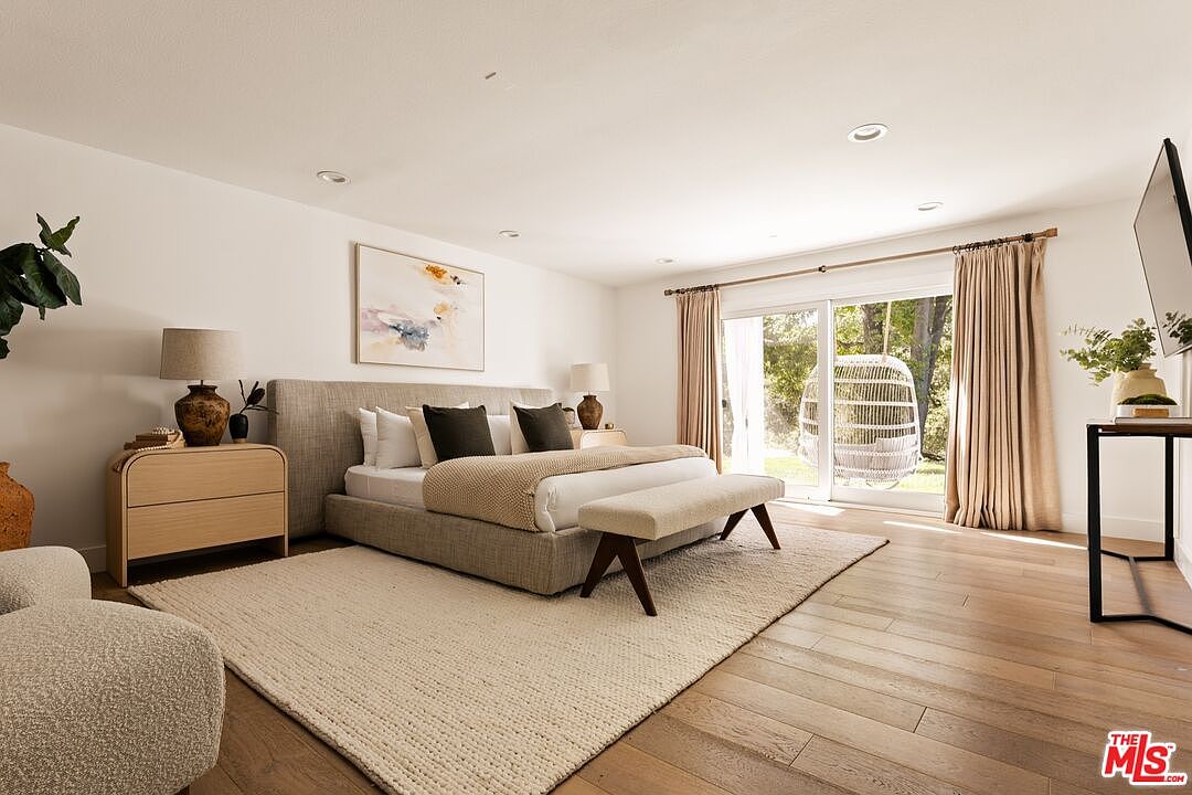 This spacious master bedroom emphasizes comfort and subtle elegance with a neutral color palette centered around soft beige, cream, and natural wood tones. The large bed features a padded headboard and is dressed with textured linens and contrasting dark throw pillows. A bench with angled legs sits at the foot of the bed atop a plush woven rug that anchors the space. Light wood nightstands hold rustic-style lamps and decor, balancing the modern with a touch of earthy warmth. Natural light floods in through sliding glass doors, framed with beige curtains, which open to a tranquil outdoor area with hanging wicker chairs. The hardwood floor adds warmth and continuity to the room’s serene, modern aesthetic.