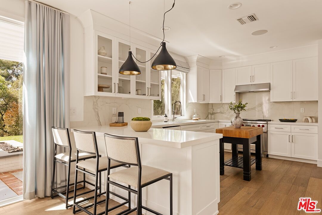 This beautifully designed kitchen features a bright and airy layout with white cabinetry and a matching marble backsplash that extends to the countertops, creating a seamless and elegant look. A breakfast bar with a smooth white surface is complemented by three high-backed, cushioned stools with black frames, providing a stylish yet comfortable seating area. Above the bar, two modern, black pendant lights with gold interiors add a touch of sophistication and warmth. Natural light floods the room through large windows and a glass door, highlighting the light wood flooring and minimalist decor, including a small plant centerpiece and streamlined kitchen accessories.