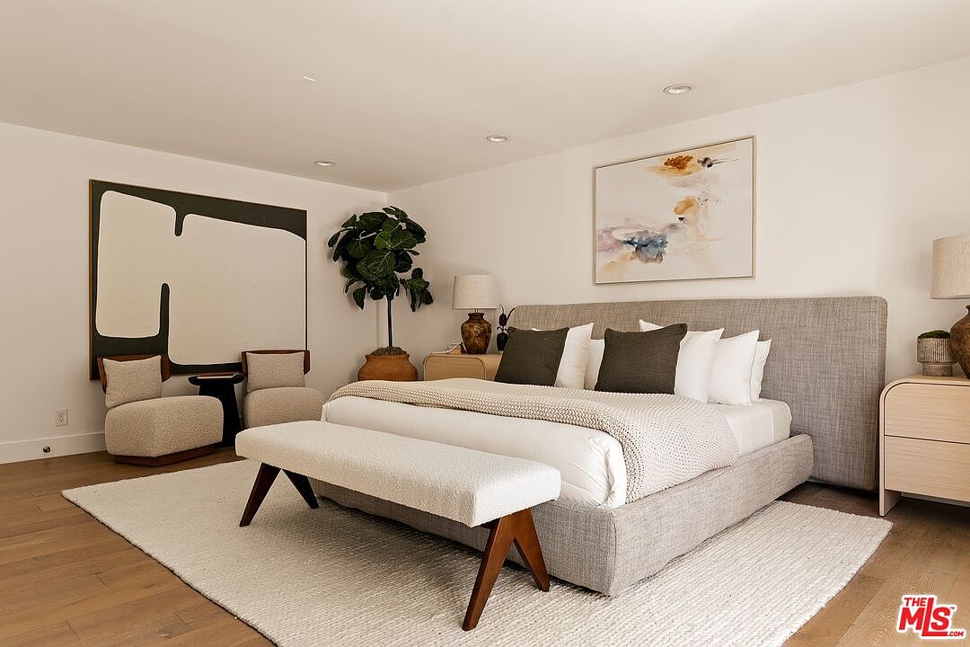 This master bedroom features a serene and inviting layout centered around a large, upholstered bed with a soft gray fabric frame. The neutral color palette emphasizes whites, creams, and subtle earth tones, creating a calming atmosphere. A textured white rug anchors the space, complementing the wooden flooring and mid-century modern bench with angled wooden legs at the foot of the bed. Two plush chairs sit against the wall beside a contemporary abstract black and cream art piece, paired with a sleek black side table. Warm wood nightstands topped with rustic ceramic lamps and a leafy green plant add natural warmth and balance to the clean, minimalist design.