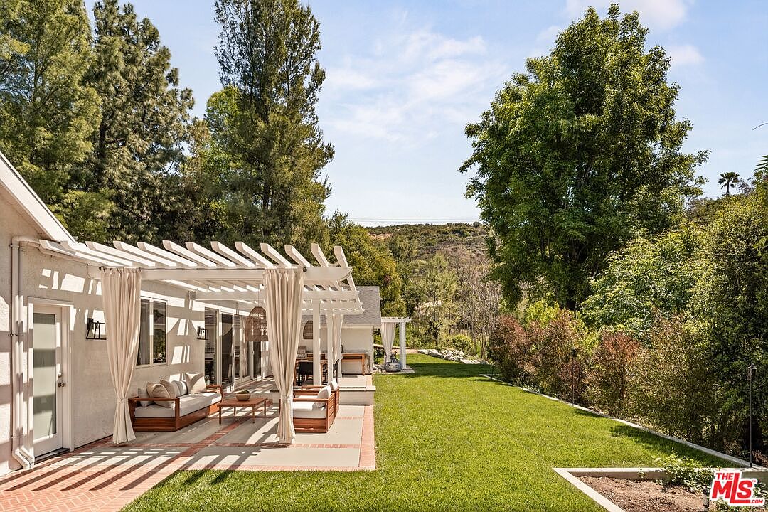 This inviting backyard patio features a spacious layout with a white pergola extending from the house, creating a shaded outdoor living area. Soft beige curtains hang from the pergola, adding an element of privacy and elegance. Comfortable wooden-framed sofas with beige cushions and a matching central coffee table foster a relaxing atmosphere. The yard is expansive and lush with a well-manicured green lawn bordered by mature trees and shrubs, offering natural privacy. The home’s exterior is painted a light, neutral tone, which complements the warm wood furniture and the bright, sunny ambiance of the outdoor space.