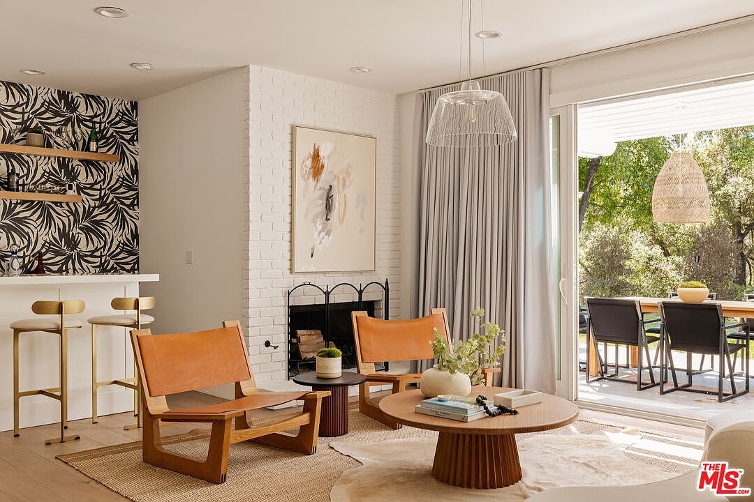 This living room radiates warmth and modern comfort with its neutral, earthy palette. A white-painted brick fireplace anchors the space, complemented by natural wood furnishings and caramel-toned leather chairs. The textured area rugs add softness underfoot, while a round wooden coffee table with a sculptural base emphasizes organic shapes. On one side, a black and white botanical wallpaper provides striking contrast against the clean white walls and open shelving behind the breakfast bar, which seats two with stylish wooden stools. Large sliding glass doors bring in abundant natural light and reveal an inviting outdoor dining space, seamlessly connecting indoors and out. Light gray curtains frame the windows, enhancing the room’s airy, relaxed vibe.