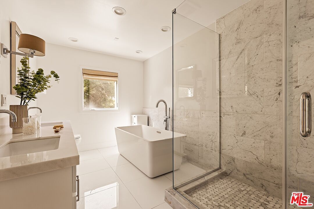 This bathroom features a clean, minimalist design with a neutral color palette dominated by whites and soft beiges. The room is spacious, showcasing a freestanding rectangular bathtub positioned near a single window with a light wooden blind, allowing natural light to softly brighten the space. A contemporary vanity with sleek faucets and a beige countertop lines one side, complemented by a simple decorative vase with greenery for a touch of nature. Opposite the bathtub, a glass-enclosed shower with marble tiles and a pebble-knit floor lends a luxurious, spa-like atmosphere to the space, blending functionality and elegance seamlessly.