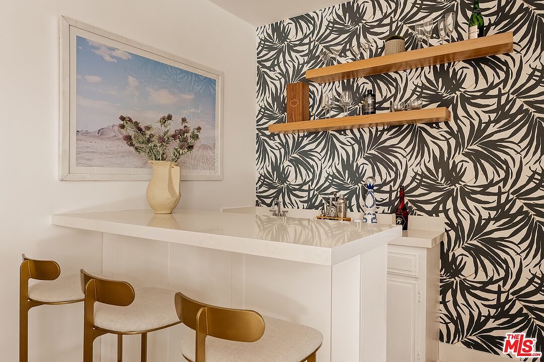 This cozy home bar presents a chic blend of modern and natural elements. A sleek white quartz countertop extends over a small white cabinet base, creating a clean and streamlined serving space. Three contemporary bar stools with olive-brown curved backs and cushioned beige seats offer inviting seating at the bar. The focal wall behind the bar features bold black-and-white tropical leaf-patterned wallpaper, which adds dramatic flair and contrast to the otherwise neutral palette. Two floating wooden shelves hold decorative bottles and glassware, complementing the natural theme and adding warmth against the monochrome backdrop. A large framed photograph of a serene desert landscape adorns the adjacent wall, enhancing the space’s artistic vibe. The overall atmosphere is modern yet inviting, perfectly suited for casual entertaining.