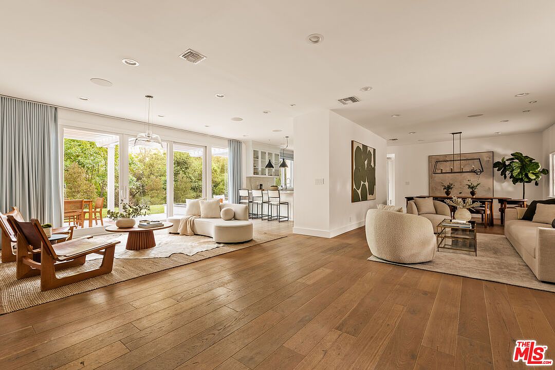 This spacious living and dining area features an open floor plan with warm, wide-plank wood flooring and a neutral color scheme of whites, creams, and natural wood tones. Floor-to-ceiling glass doors along one wall reveal lush outdoor greenery and bring in abundant natural light. The seating includes a modern cream sectional with round and curved shapes, paired with wooden chairs and multiple area rugs to define spaces. A minimalist kitchen bar with black stools and pendant lights can be seen in the background. Abstract art and greenery enhance the serene and contemporary ambiance.