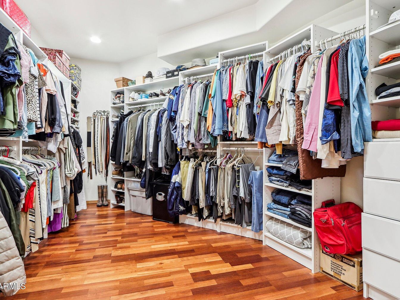 This walk-in closet features a well-organized, spacious layout optimized for clothing and accessory storage. White shelving units and hanging rods line both sides, holding a variety of garments from jackets and shirts to folded jeans and bags. The medium-tone hardwood floor adds warmth and contrast against the crisp white built-in shelves, lending a clean and modern aesthetic. Overhead recessed lighting brightens the space evenly, enhancing visibility. Shelves extend to the ceiling, accommodating boxes and hats. The closet shows thoughtful functionality combined with tidy, efficient use of space, ideal for easy access and daily organization.