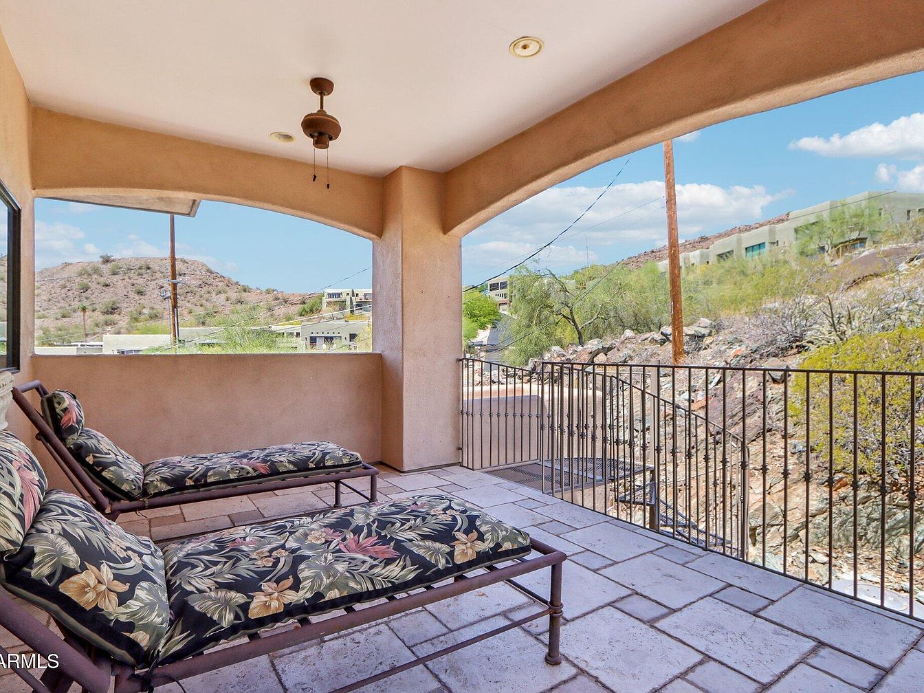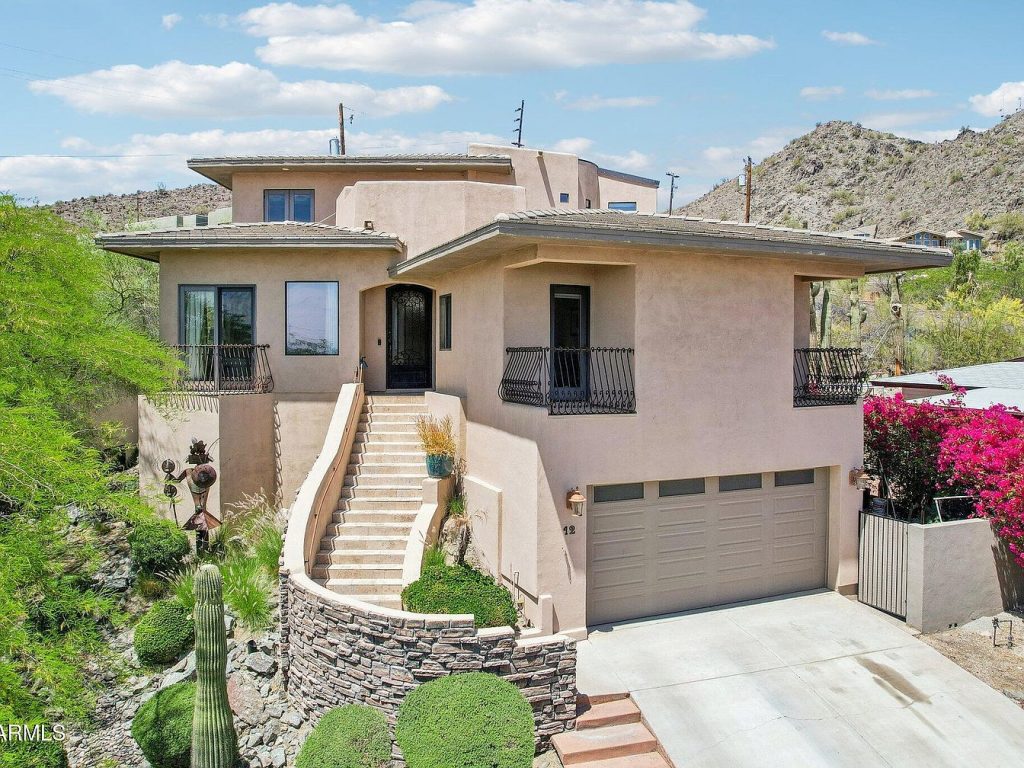 This stunning home located in the foothills of Phoenix, Arizona, exemplifies contemporary Southwestern architectural style with its clean lines, stucco exterior, and integration into the natural desert landscape. Built to embrace the hillside terrain, this custom-designed residence offers spectacular panoramic views of the city skyline and the North Mountain Preserve, creating a serene backdrop for luxury living. Featuring 4 bedrooms and 4.5 bathrooms, every bedroom is ensuite, ensuring privacy and comfort for all guests. Situated minutes away from the vibrant Central Avenue dining, arts, and nightlife, yet with direct access to hiking trails, this property perfectly balances urban excitement with mountain tranquility.