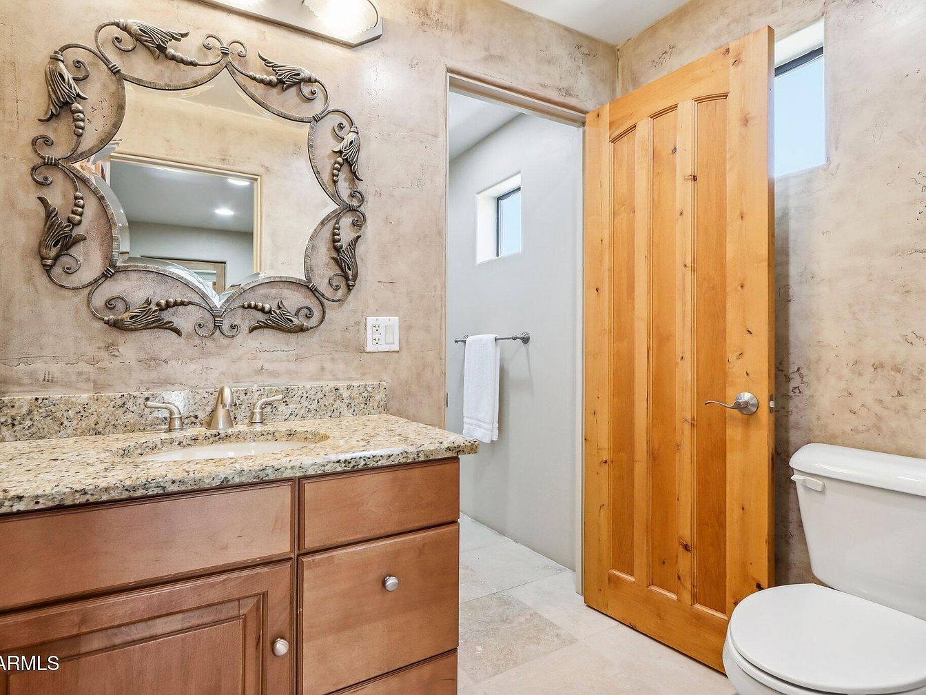 This bathroom features a warm, natural aesthetic with textured beige walls that provide an earthy, rustic feel. The vanity has a polished granite countertop with beige and brown tones complementing the natural wood cabinets below. Above the sink hangs an ornate mirror with intricate metalwork details, adding a decorative, vintage touch. The wooden door, left ajar, introduces warmth with its rich honey-colored wood and vertical panels, creating a sturdy, welcoming entrance to the room. The adjacent white toilet and light stone floor tiles maintain a neutral palette, balancing the overall design with simplicity and functionality.
