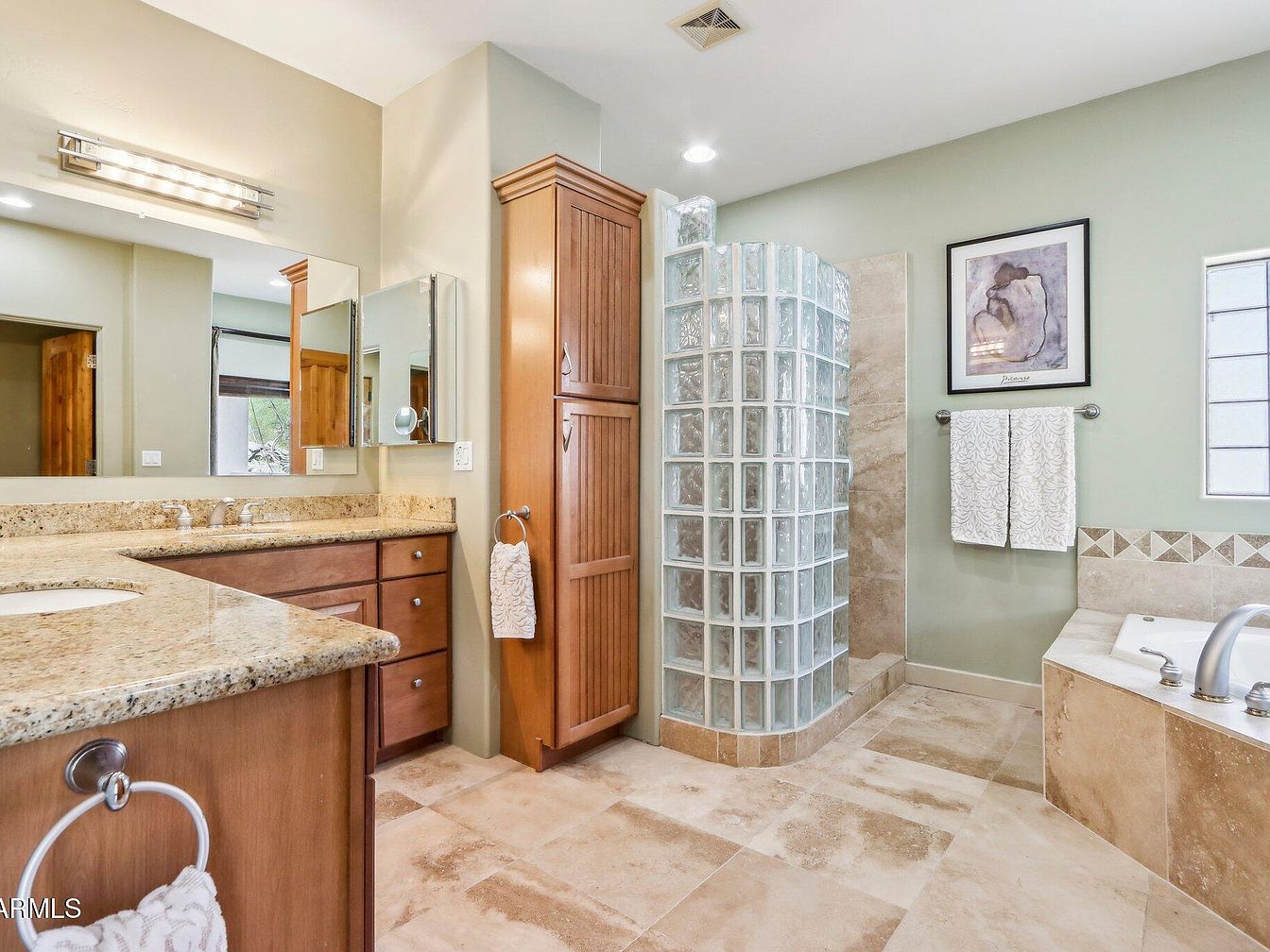 This spacious master bathroom combines natural tones and elegant finishes for a soothing aesthetic. The L-shaped vanity boasts granite countertops with undermount sinks and is paired with rich wooden cabinetry. A large mirror with horizontal light bars brightens the space. The floor is tiled in warm, polished stone that complements the neutral walls. A prominent curved glass block shower enclosure adds a touch of vintage charm while maintaining openness. Adjacent is a soaking tub with silver fixtures, set into matching stone surround. Artwork and patterned towels enhance the room’s inviting and polished feel.