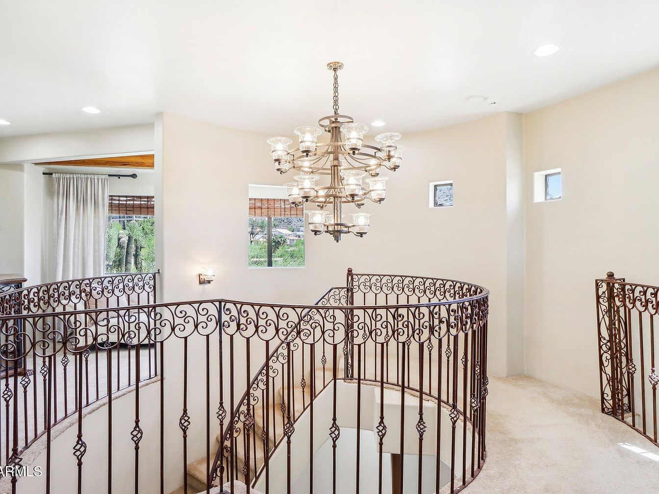 This upstairs landing features a graceful curved staircase bordered by an ornate wrought iron railing with elegant scrollwork and diamond-shaped accents. The walls are painted a soft, creamy beige that complements the light carpeted floor, creating a warm and inviting atmosphere. A large multi-tiered chandelier with glass shades hangs from the ceiling, providing both illumination and a touch of grandeur. Strategically placed small square windows allow natural light to filter in, while recessed ceiling lights enhance brightness. A glimpse of draped curtains from an adjoining room adds softness and texture to the space.